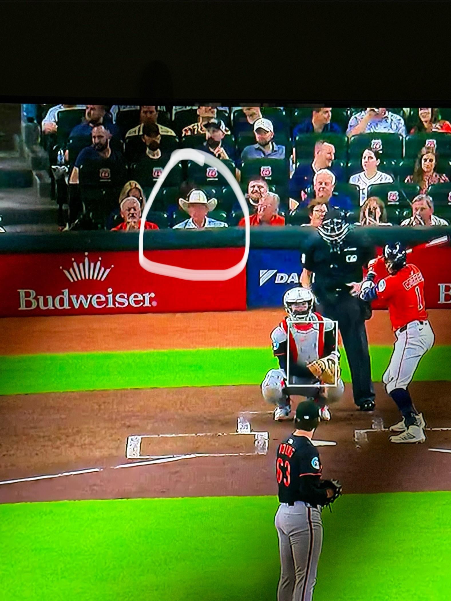 This is the second time I’ve seen where someone in first row or first few rows behind the plate has had their face blurred out on the telecast (Fubo). Last time it was a group of three, this time it’s the guy wearing the cowboy hat. Got me curious