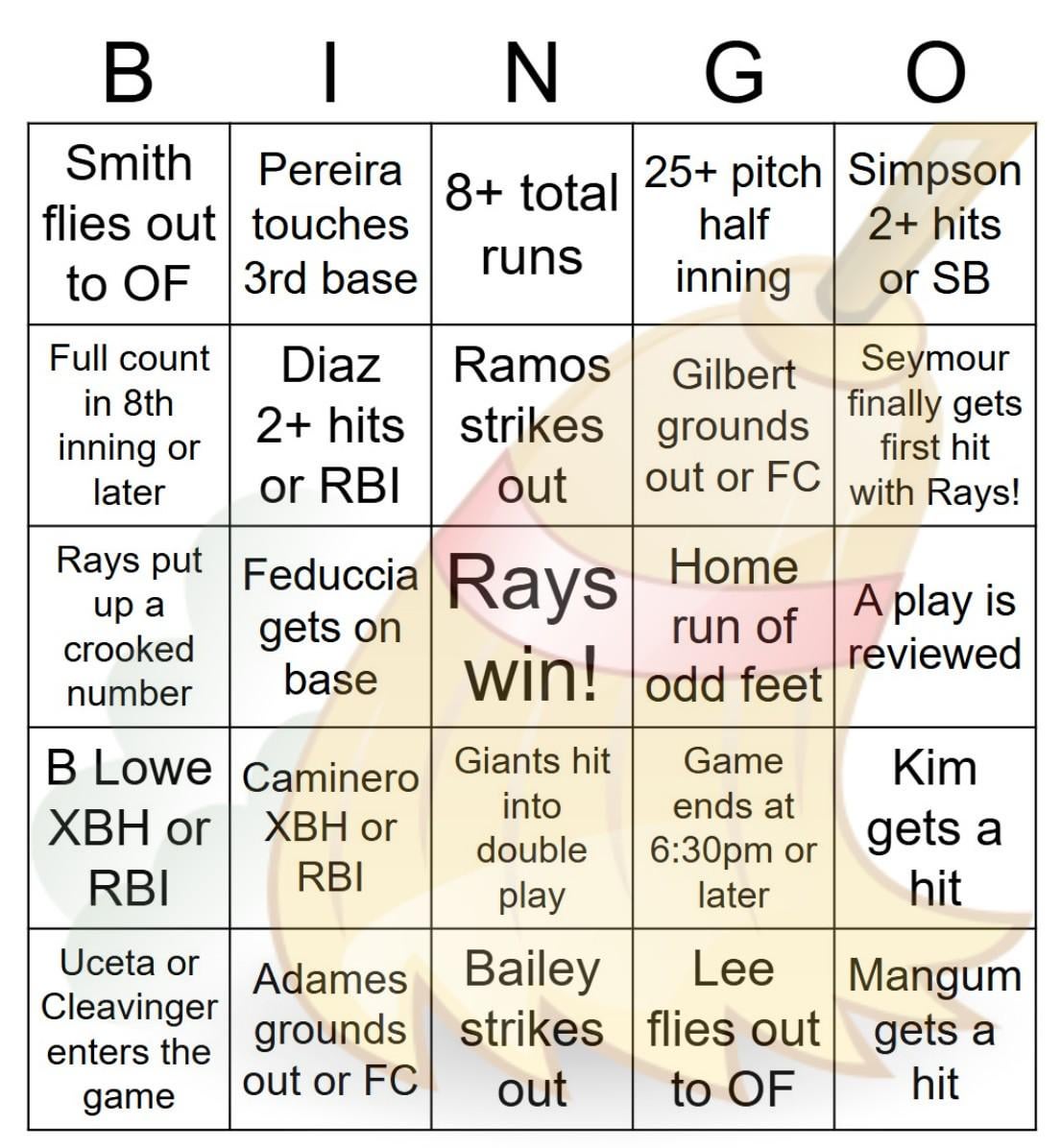Rays vs Giants Bingo, Sweep Edition, 8/17/2025