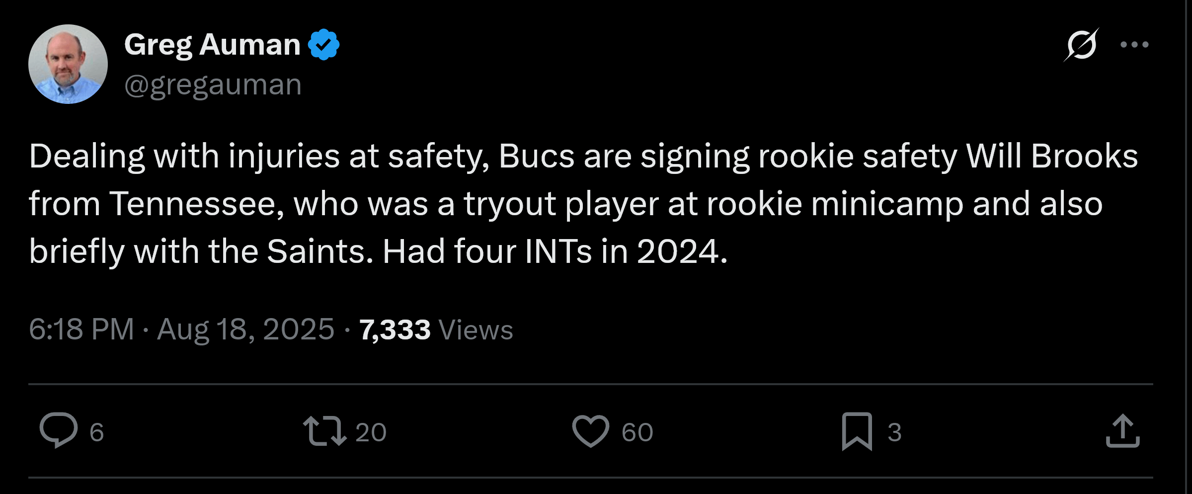 [Greg Auman] Dealing with injuries at safety, Bucs are signing rookie safety Will Brooks from Tennessee, who was a tryout player at rookie minicamp and also briefly with the Saints. Had four INTs in 2024.