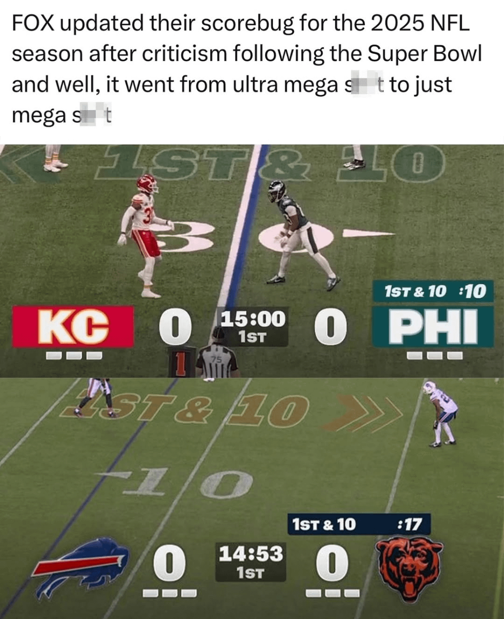 My theory is that it was made because a lot of the audience is boomers who now have bad eyesight and need large font. But, they couldn’t keep the original (opaque) scorebug with large font, because it’d block a lot of the screen. So they tried to make large font with a transparent scorebug, and this is the result.