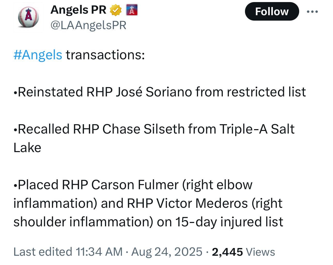 Even with Soriano’s return, Mederos going on the IL means we have once again lost our fifth starter. Silseth has been deployed as a single-inning reliever. And now even Fulmer, who’s been our long reliever, is on the IL.