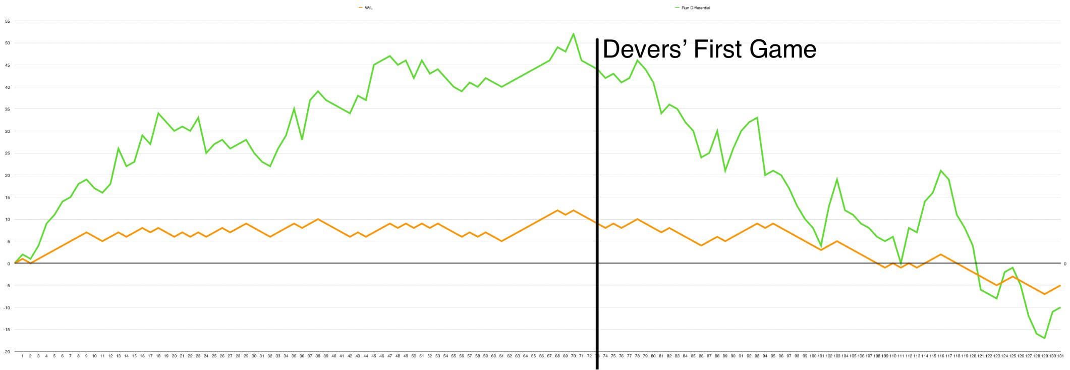 Just for clarity, I only included Devers’ first game because it is a major turning point for the organization. I do not in any way think he is the reason for the team struggling
