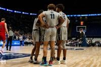 The team huddles after a play in Penn State men’s basketball’s game against Saint Francis in the Bryce Jordan Center on Tuesday, Nov. 12, 2024 in University Park, Pa. The Nittany Lions beat the Red Flash 92-62.