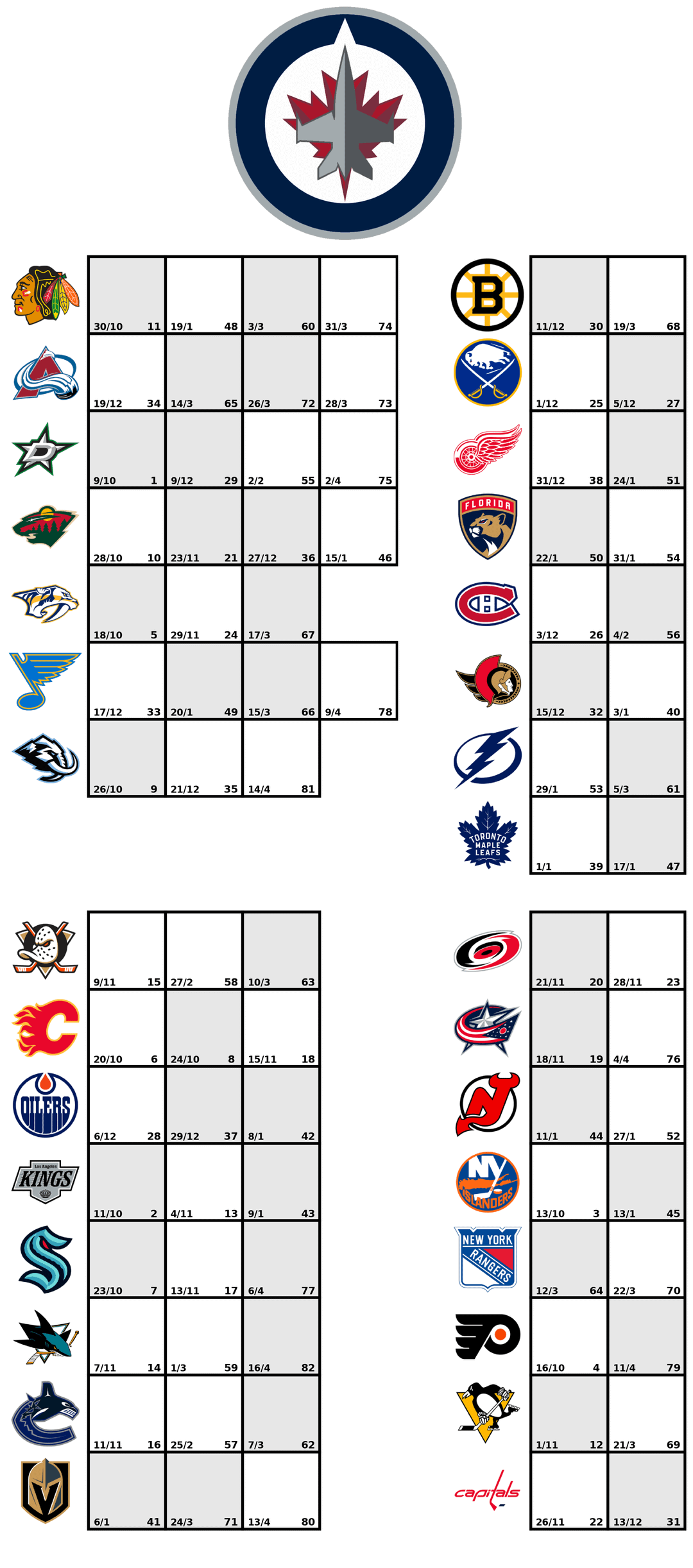 I've adapted this tracker for hockey by creating 2 versions for each team. The first one groups games by opponent, and the second shows games in chronological order. Each square includes the date and game number. Grey squares are home games.