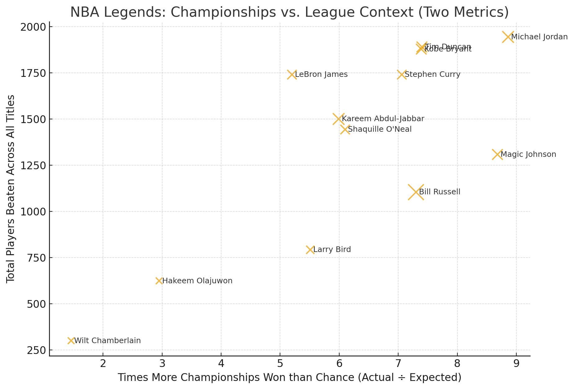 NBA Legends: Championships vs. League Context (Two Metrics)
