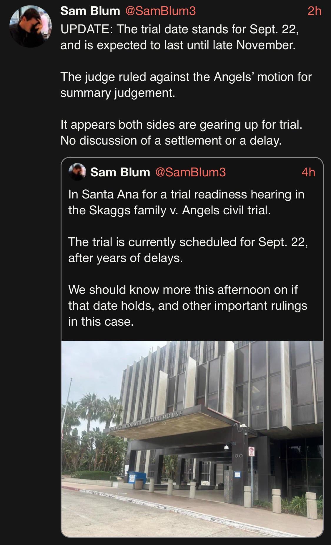 [Sam Blum] Skaggs family lawsuit against Angels set for September