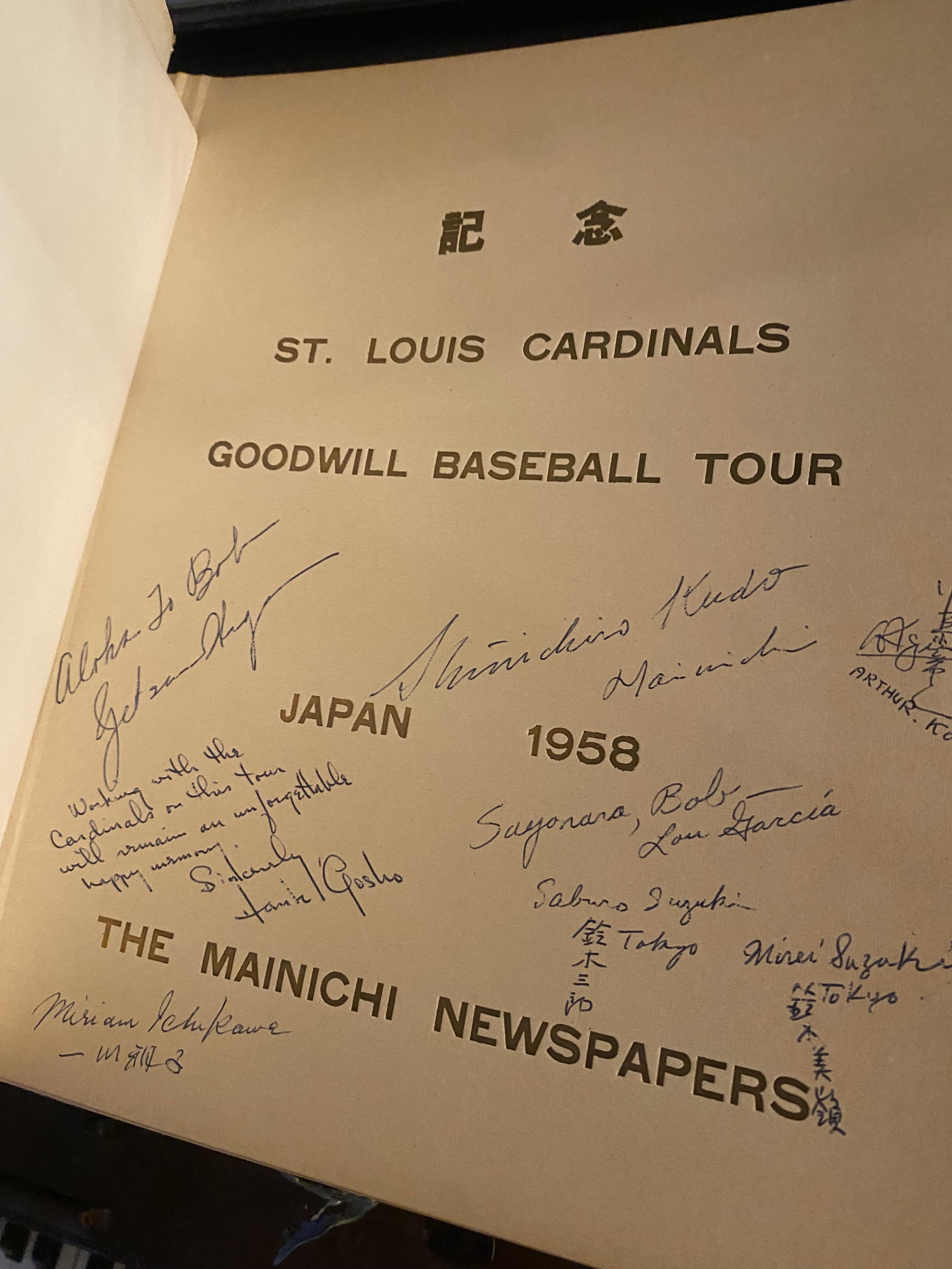 1958 cardinals tour to Japan scrapbook I found. Has everyone’s signatures including some of the Japanese players. It’s full. Only one pic allowed 5 comments I think you can put more pics in the comment section? This needs to go to Cooperstown. They have a whole floor dedicated to stuff like this In The Wind Up Bird Chronicle by Haruki Murakami the protagonist mentions this series I have a ticket stub from one of these games. Its so interesting to me I need more details on “I found”. Where? Something like this doesn’t turn up under the couch cushions. Leave a ReplyYou must be logged in to post a comment.