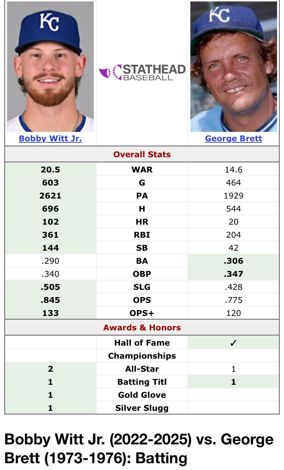 This may not be a popular opinion, but Witt is already a superior talent to Brett. He plays elite defense at one of the most difficult positions and is an excellent baserunner. He’s still early in his career, sure, but his trajectory is that of the best player in franchise history.