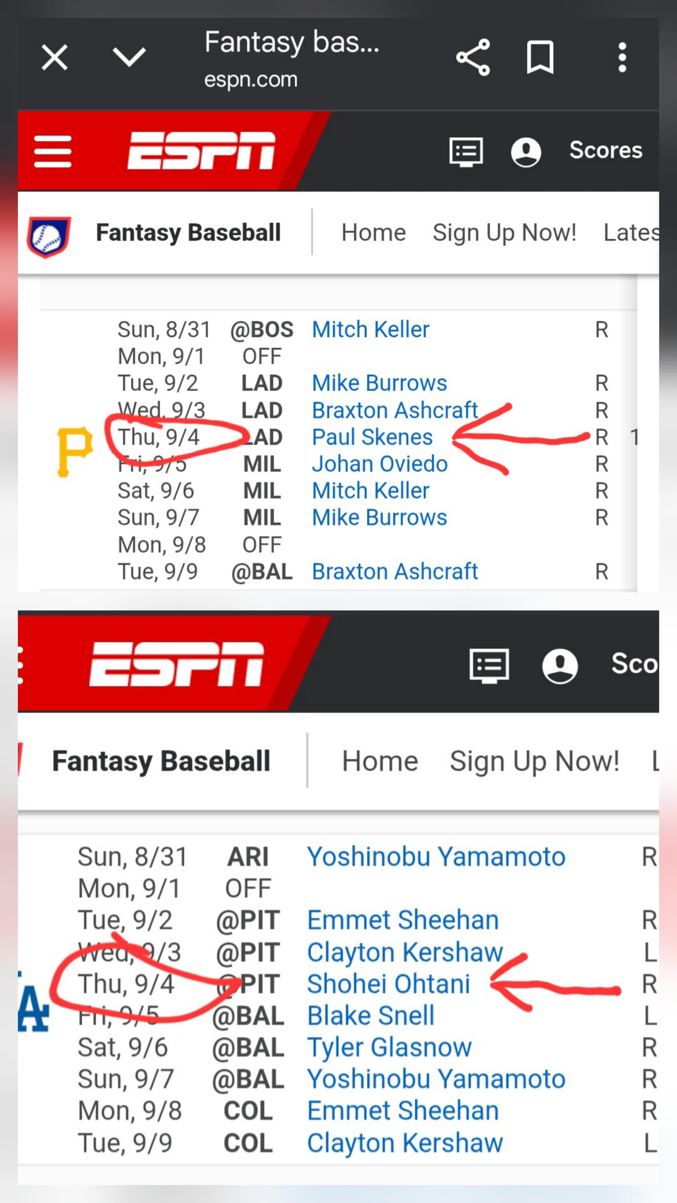 I bought tickets for 9/4 game against Dodgers over a month ago and I checked to see probable pitchers and I bout shidded my pants. Chat is this real? Is there a better site to look, or am I about to see a dream matchup?