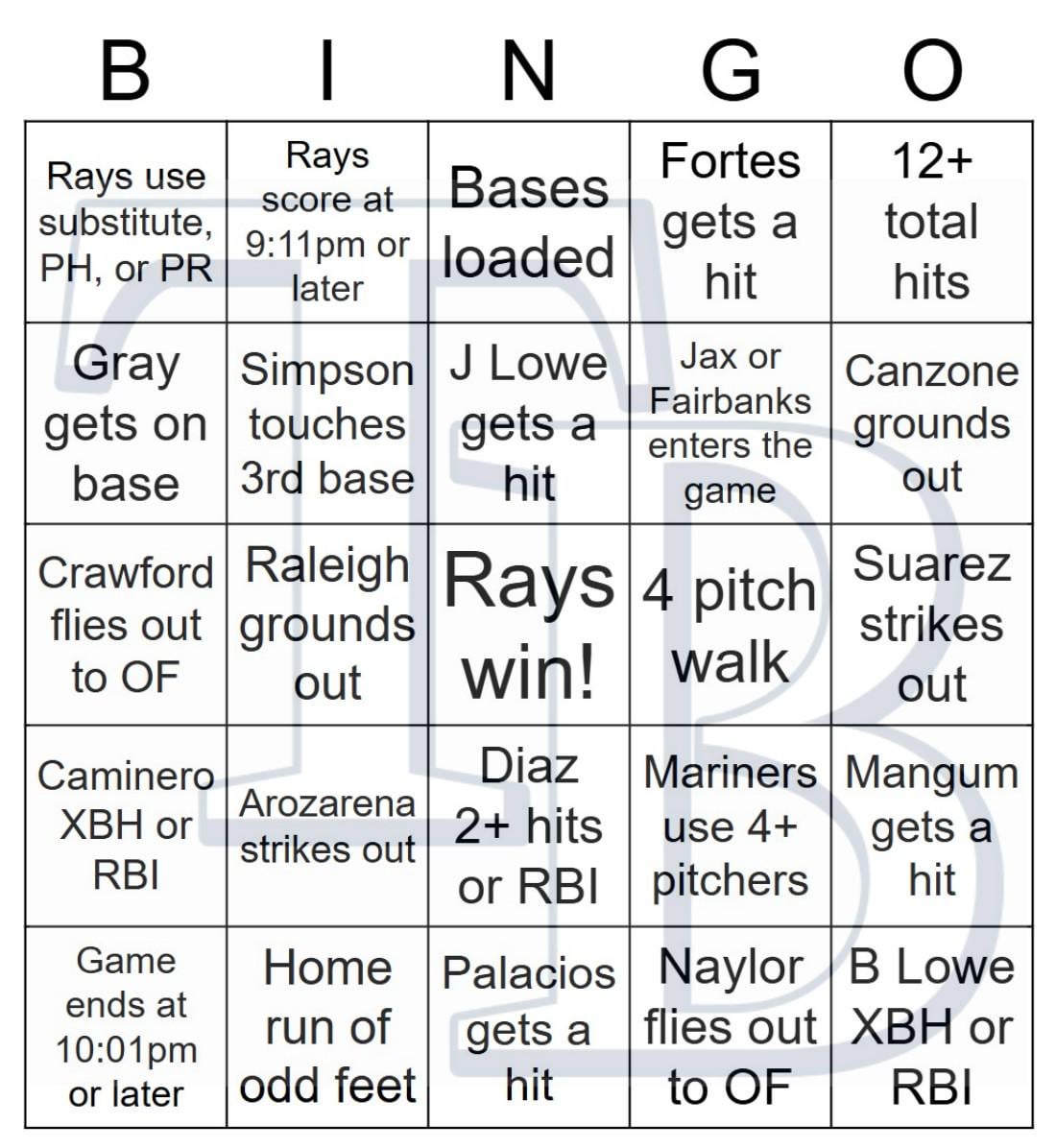 Rays vs Mariners Bingo, 9/01/2025
