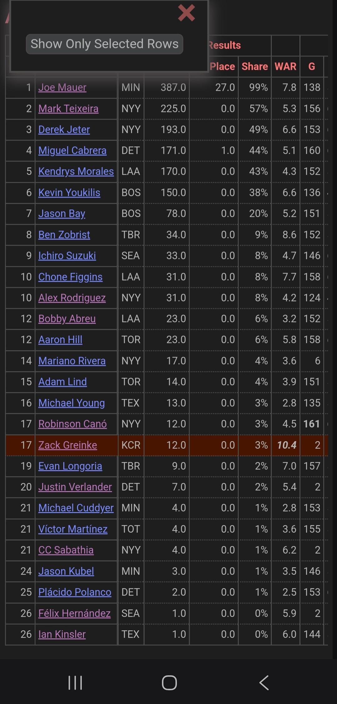 Mauers cool and all but Greinke put up a 16-8 record, 2.16 ERA, 6CG,3SHO,229.1 IP, 242 Ks, ERA+ of 205!!, 2.33 FIP, 1.073 WHIP, had 2.6 more WAR than Mauer, had higher WPA, and led the league in HR/9, ERA, WAR, ERA+, FIP, and WHIP. 2009 Greinke was one of the most dominant pitching seasons i've seen and should've won MVP IMO.