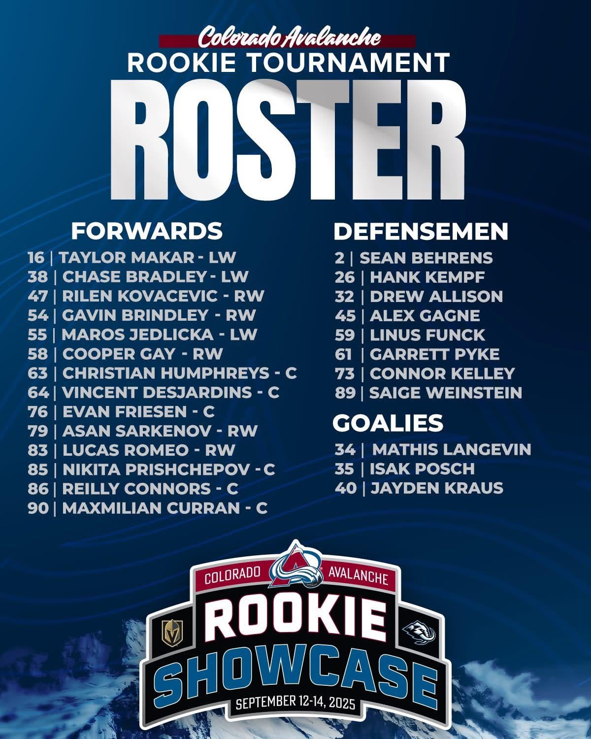More info :[https://www.nhl.com/avalanche/news/avalanche-announce-2025-rookie-showcase-roster?fbclid=IwVERDUAMkQu5leHRuA2FlbQIxMAABHtjnaFVCWjOgZuzD6Tb0svY7eh8rLM-7d2RLUOgnP_A7sxKCc1Sl9udpNs5n_aem_HTABP-h6Et-iYX7z4TqZqQ](https://www.nhl.com/avalanche/news/avalanche-announce-2025-rookie-showcase-roster?fbclid=IwVERDUAMkQu5leHRuA2FlbQIxMAABHtjnaFVCWjOgZuzD6Tb0svY7eh8rLM-7d2RLUOgnP_A7sxKCc1Sl9udpNs5n_aem_HTABP-h6Et-iYX7z4TqZqQ)