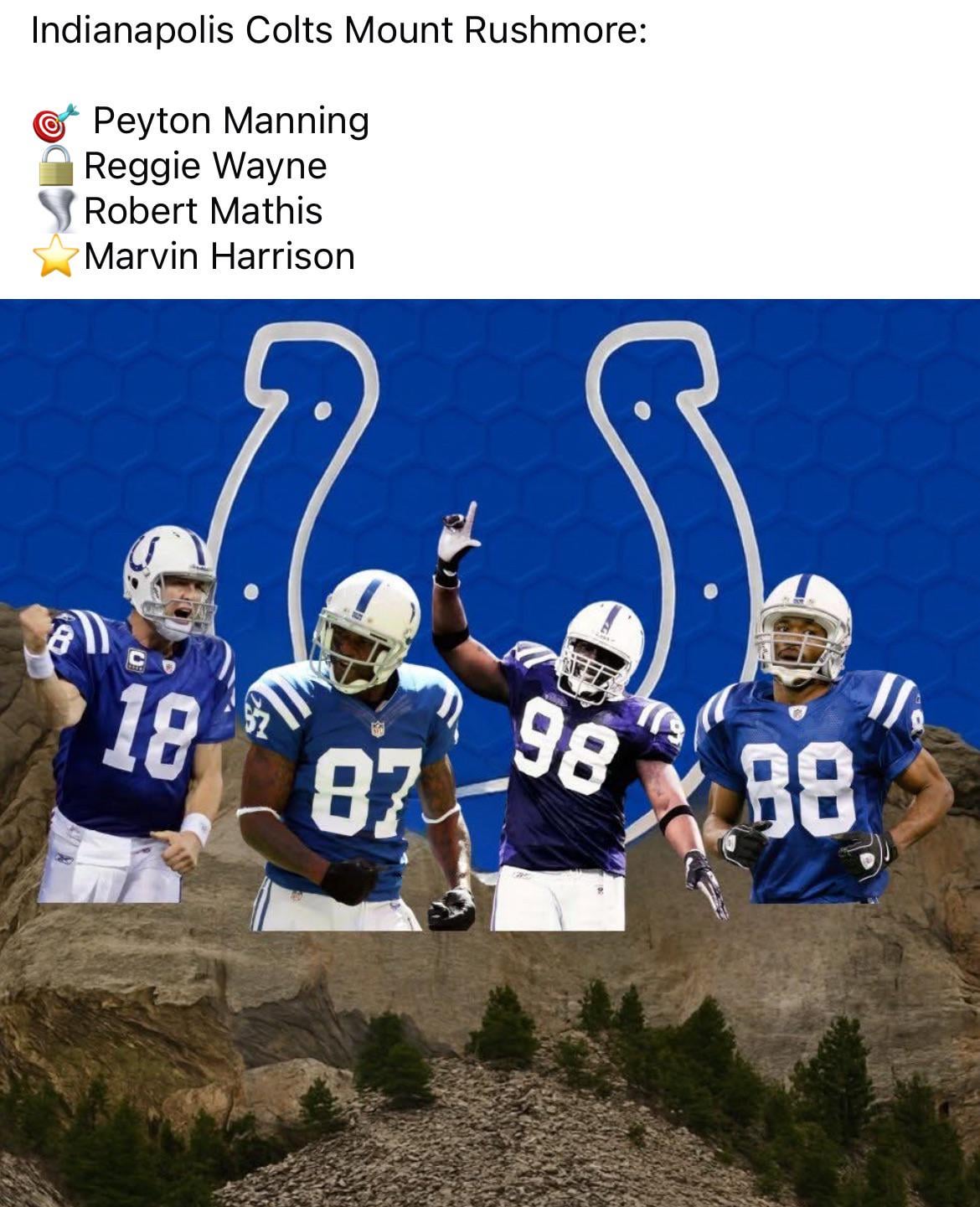 They forgot my guy, Edgerrin! 21 comments Dwight Freeny? I’m sorry it’s gotta go Peyton, Edge, Harrison, Freeney. You left off Super Bowl winning QB Jim Sorgi? For me my defensive goat was Bob Sanders. If only he stayed healthy Too many great Colts to put on Mount Rushmore Manning, Freeney, Harrison and Unitas This list is perfect. If you only know the last 30 years of Colts football. Just for fun, Manning era TD leaders (passing): – Marvin Harrison: 114 – Reggie Wayne: 76 – Dallas Clark: 48 – Marcus Pollard: 35 – Brandon Stokley: 24 – Austin Collie: (rip) 17 – Pierre Garcon: 13 – Edge James: 11 Can we make a Mount Rushmore of WRs overhyped in training camp? Great to see rob getting love Mathis still involved in that weird cult? Where’s that half season of Jacob Tamme? 🐐 No Dwight Freeney?!?? Honorable mention: Vinatieri. Dallas Clark and definitely Edge Not having Edge is fucked man smh Bad list without Johnny U Jesus god did a 10 yr old make this? Is this just since they moved to Indy I’m assuming? edge is the reason I’m a colts fan– I’m from NY! Where’s Carson Wentz??? Leave a ReplyYou must be logged in to post a comment.