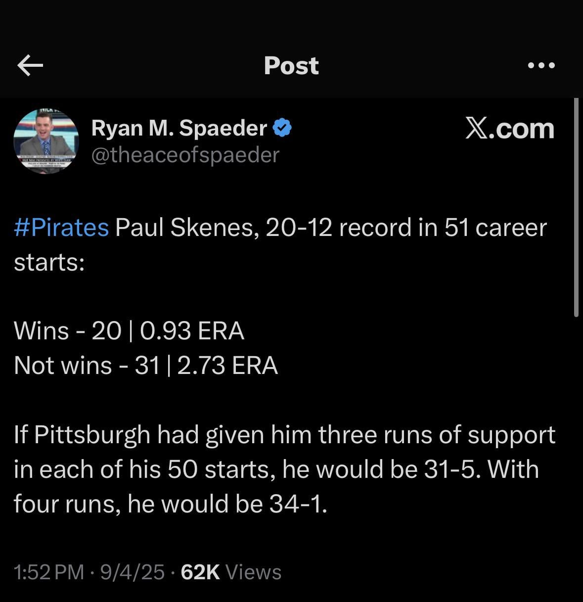3. Skenes gets off easy. After all he’s only been unsupported for 50 games.