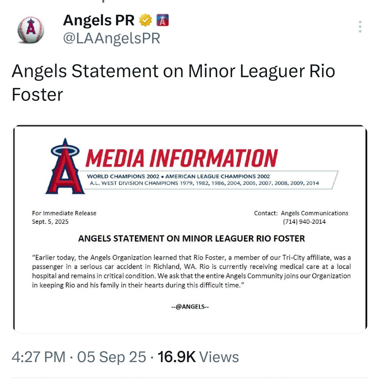 From Taylor Blake Ward on X: โFacebook: Richland PD (WA) reported car accident at 2am Friday in Richland where two passengers were ejected from vehicle with potential DUI driver, sources close to situation confirmed that Angels prospect Rio Foster was one of the parties involvedโ