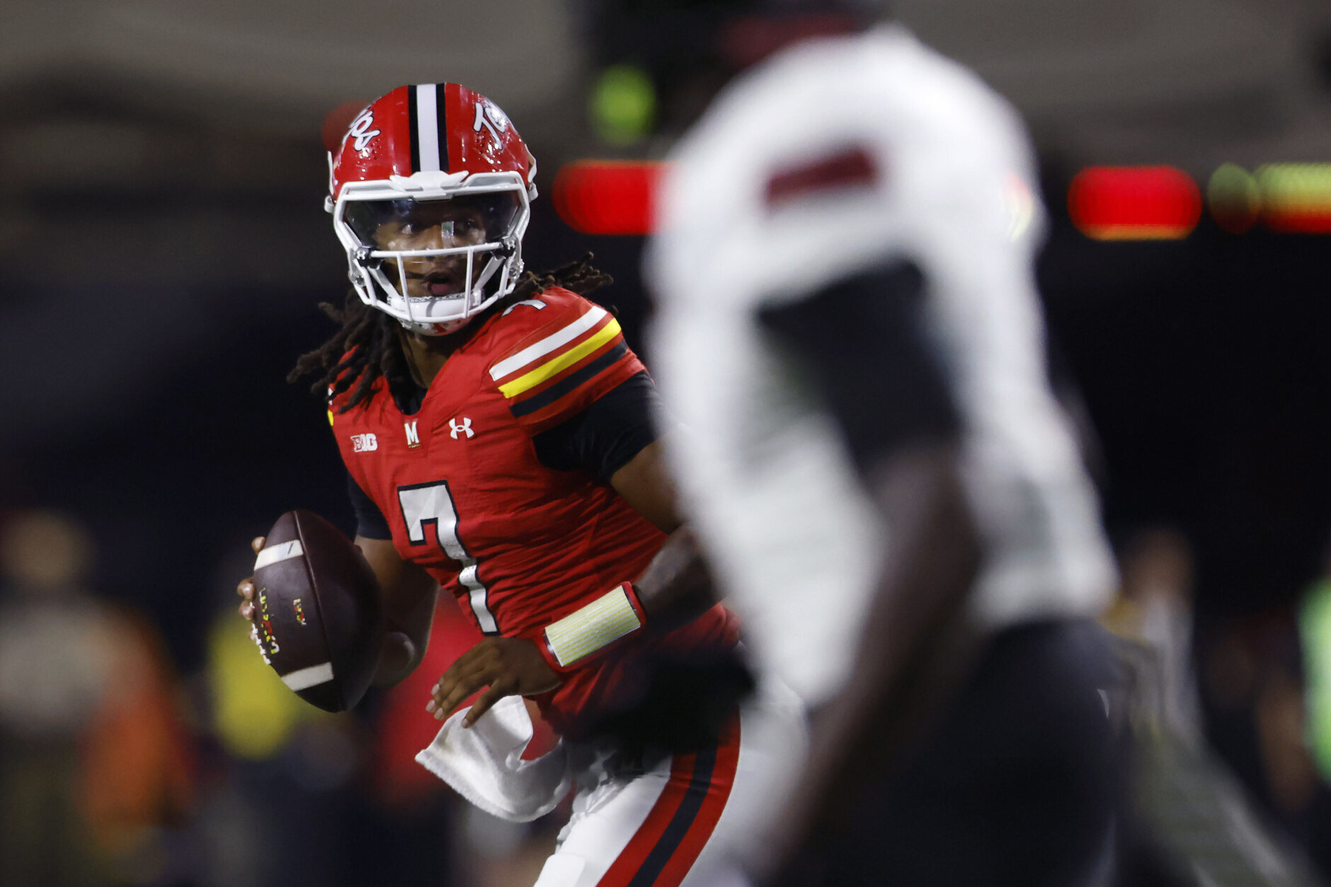 Northern Illinois Maryland Football Maryland quarterback Malik Washington (7) looks to pass during the second quarter of an NCAA football game against Northern Illinois on Friday, Sept. 5, 2025, in College Park, Md. (AP Photo/Mike Buscher)