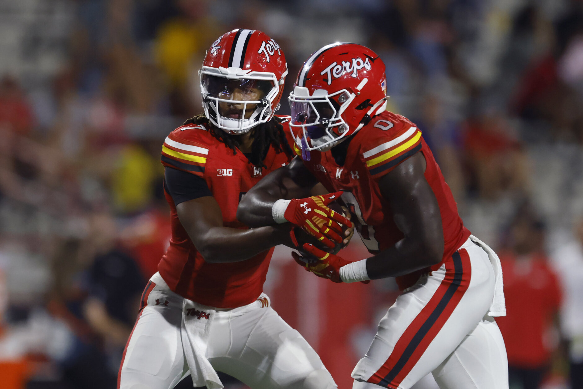 Northern Illinois Maryland Football Maryland quarterback Malik Washington (7) hands off to running back DeJuan Williams (0) during the second half of an NCAA football game against Northern Illinois on Friday, Sept. 5, 2025, in College Park, Md. Maryland won 20-9. (AP Photo/Mike Buscher)