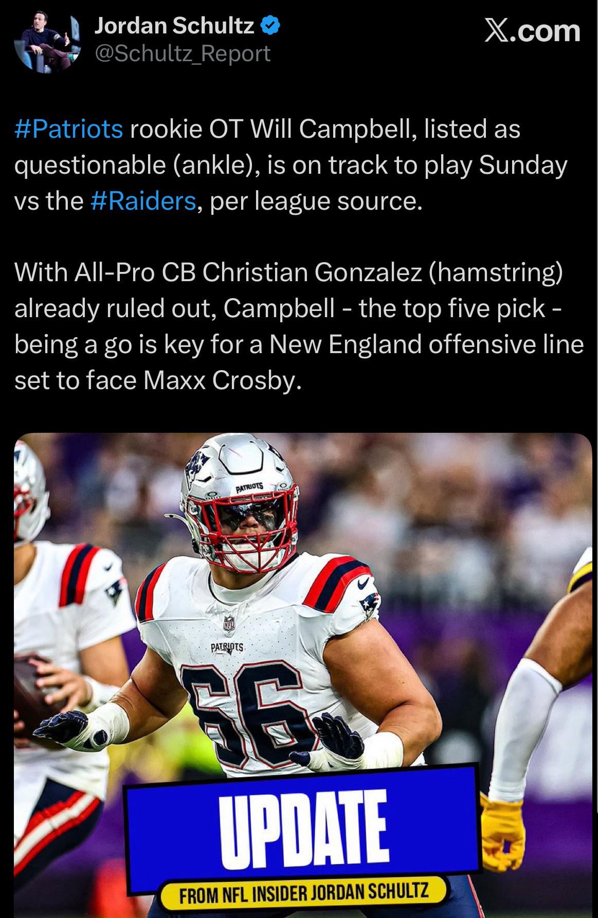 Glad but I hope he isnβt pushing it. We need him for the next 10 years, not for one Raiders game.
