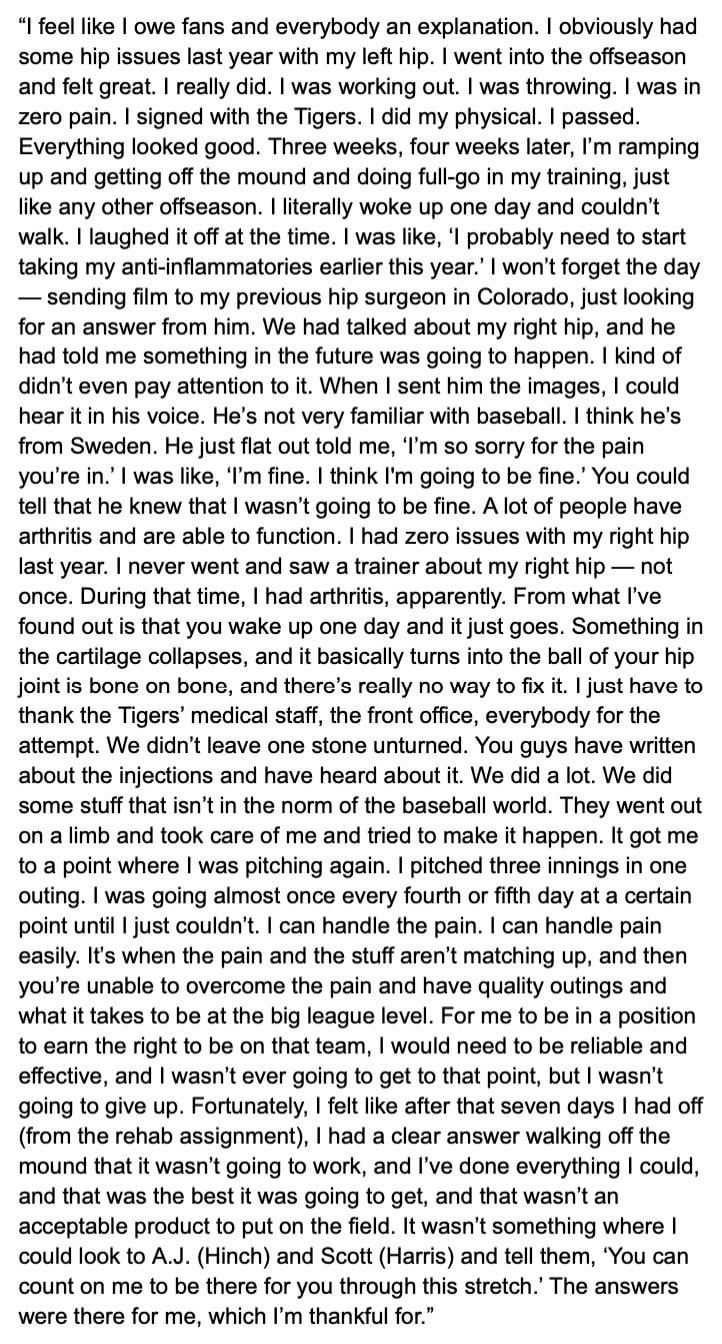 Cannot blame Alex at all and not really interested in his explanation. He’s old and hurt, it happens. He was going to retire and the tigers offered him a lot of money to not retire, everyone would’ve done the same thing.