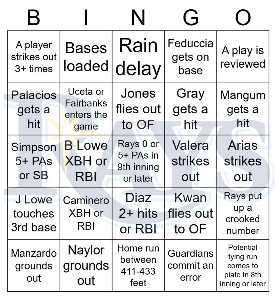 Rays vs Guardians Bingo, 9/06/2025