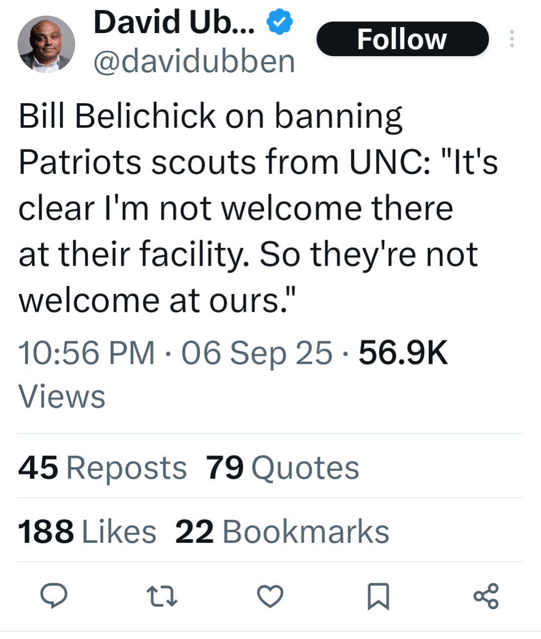 Belichick is saying explicitly, he’s not welcomed at Gillette. That’s fucked up, and there’s no reason for him to come out and lie about that verbatim. He’s not suggesting something, or insinuating something. He’s straight up saying, I’m not welcome there.