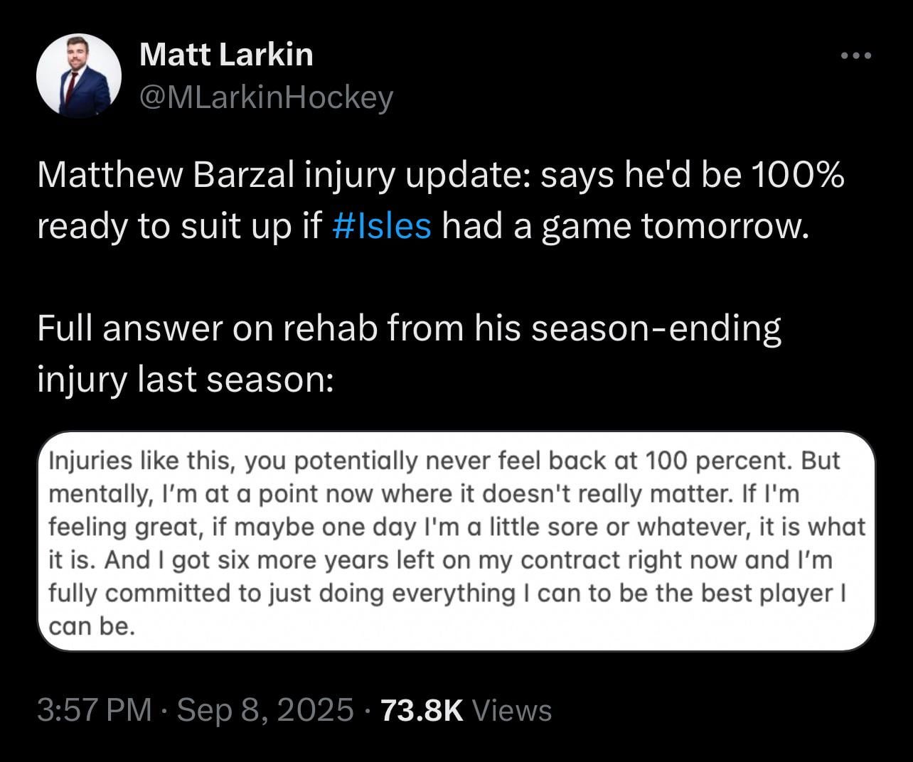Not trying to read too much into this but sounds like he’s not thrilled with how he feels.. fingers crossed we get the same Barzy back (or one who shoots the puck 😉)