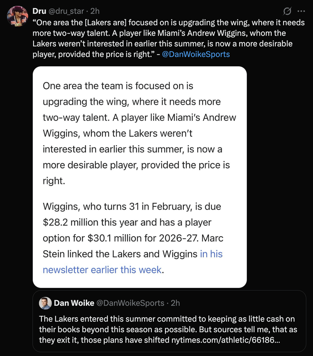 “A player like Miami’s Andrew Wiggins, whom the Lakers weren’t interested in earlier this summer, is now a more desirable player, provided the price is right.” – Lakers Reporter for the Athletic, Dan Woike