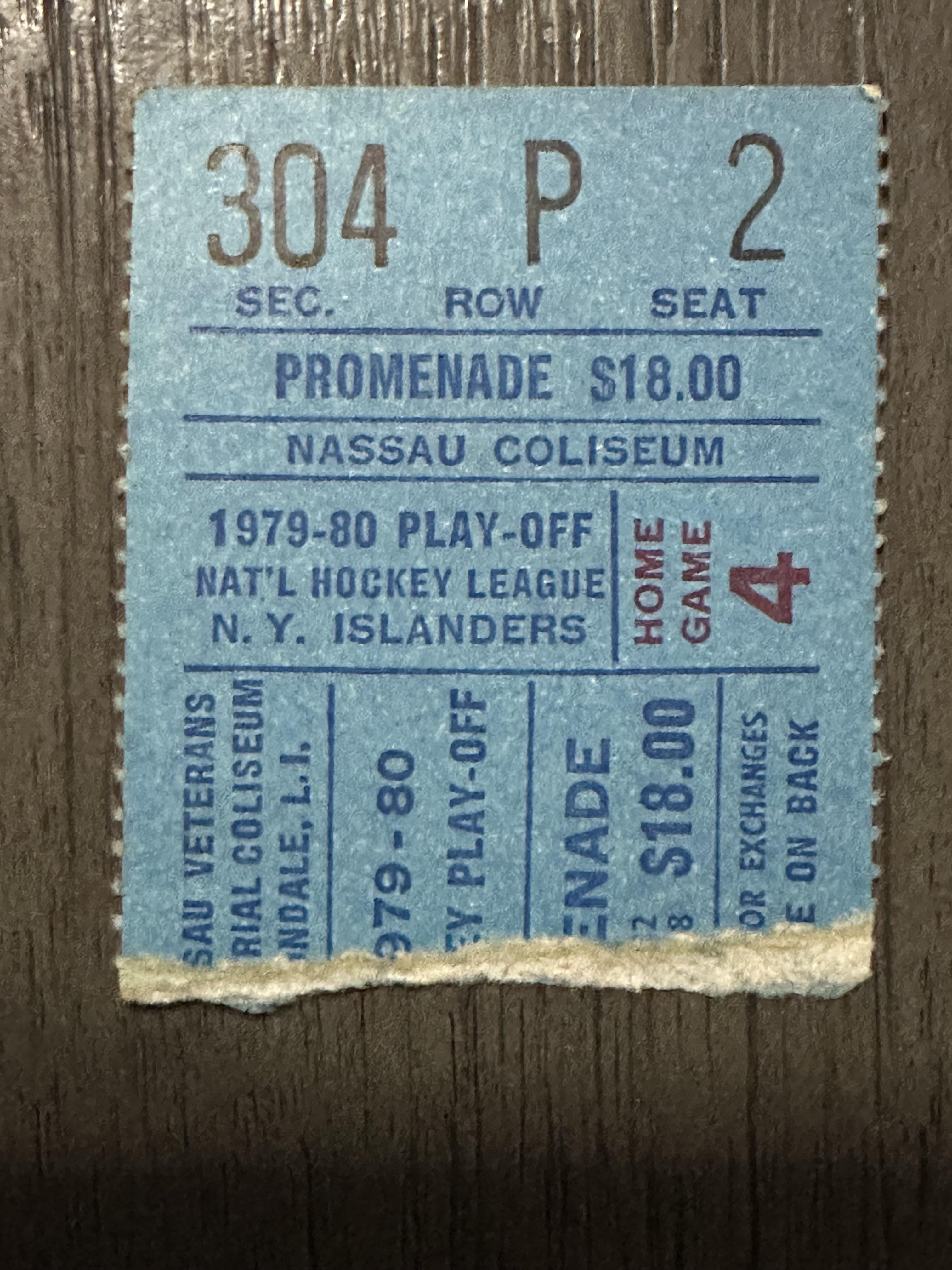 This would have been from the Quarterfinal Round that season vs the Bruins. I can’t remember though if the Game number printed on the ticket was for the 4th scheduled game or the 4th actual game (they had 3 scheduled home games in the prelim round but only needed to play 2). So it’s either Game 3 (Isles won 5-3) or Game 4 (Isles lost 4-3) from that series.