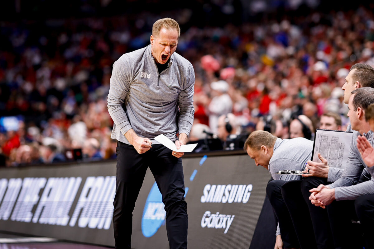 BYU men’s basketball coach Kevin Young (left) reacts during a 91-89 victory against Wisconsin in the second round of the NCAA Tournament at Ball Arena in Denver, Colo., on Saturday, March 22, 2025.