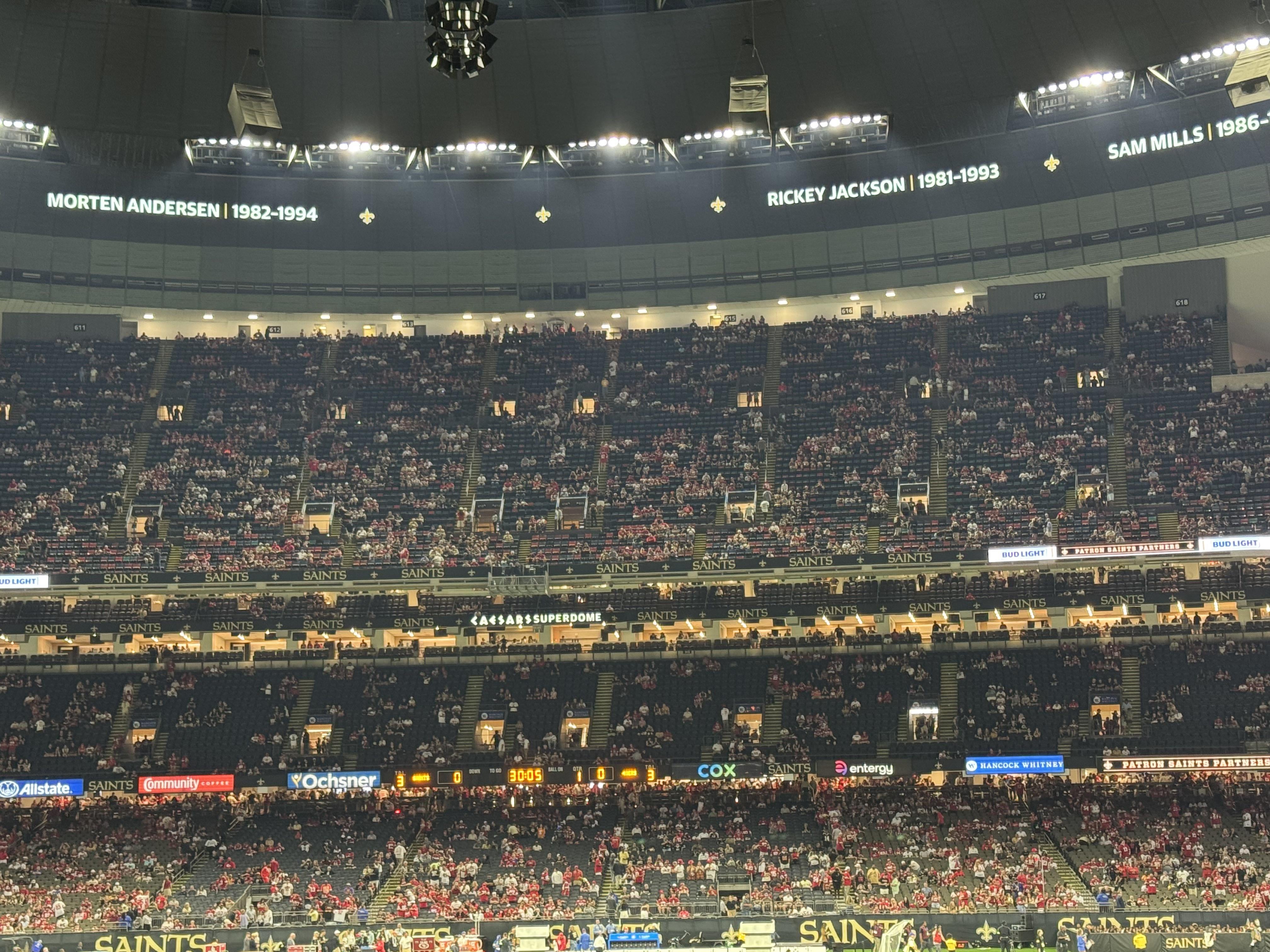There are more 49ers fans than most visiting teams, but they’re far from the majority. The bright red stands out a lot more than the mix of black, white, different shades of gold, etc. that us Saints fans are wearing. Now that the stadium is full, if you look at a whole section it kinda looks 50/50, but if you count heads it’s closer to 10% red. Just the nature of bright, primary colors contrasted against more muted colors.