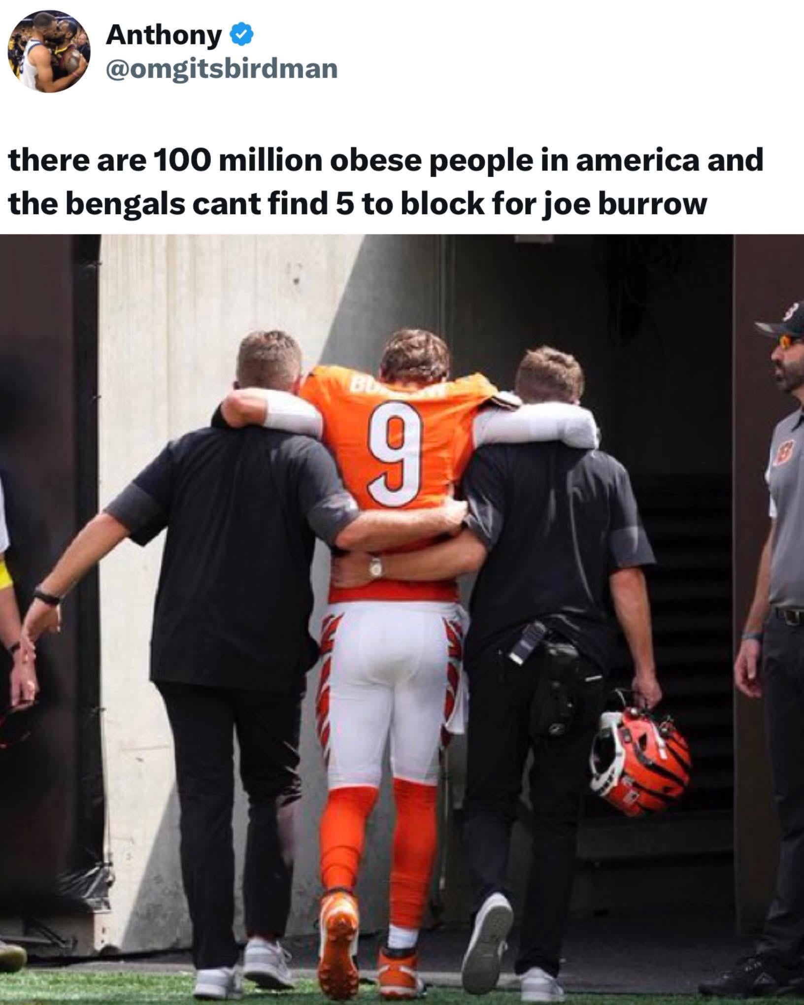 That’s pathetic 14 comments Holy fuck that’s funny “Let’s spend 170 billion dollars on 3 players” Hahahhaahhahahahhahahha… ok, that was nearly perfect The O-line isn’t great but this dude is made of glass and holds the ball too much. Yea but it’s not just obese. It’s obese AND athletic Don’t worry, you have the whole Jags offense out there doing everything that can to keep Cinci in the game. Someone get me a few chili dogs, I’m going in! Mike Brown has been a dogsh*t owner for 30 years & dumbass Bengals fans haven’t noticed the pattern. Burrow will pull a Carson soon They should bring in Charlie Sheen’s ex-drug dealer. Dude is huge, loyal as fuck, and he’s always going to have to ya dig on him. Welcome to a dolphins fan I know it’s a joke but it bugs me when people think pass protection doesn’t require elite skills Cardiac cats. Of course if you’re a Jags fan you’re screaming at their QB there goes my mf fantasy season I got you, Joe Leave a ReplyYou must be logged in to post a comment.