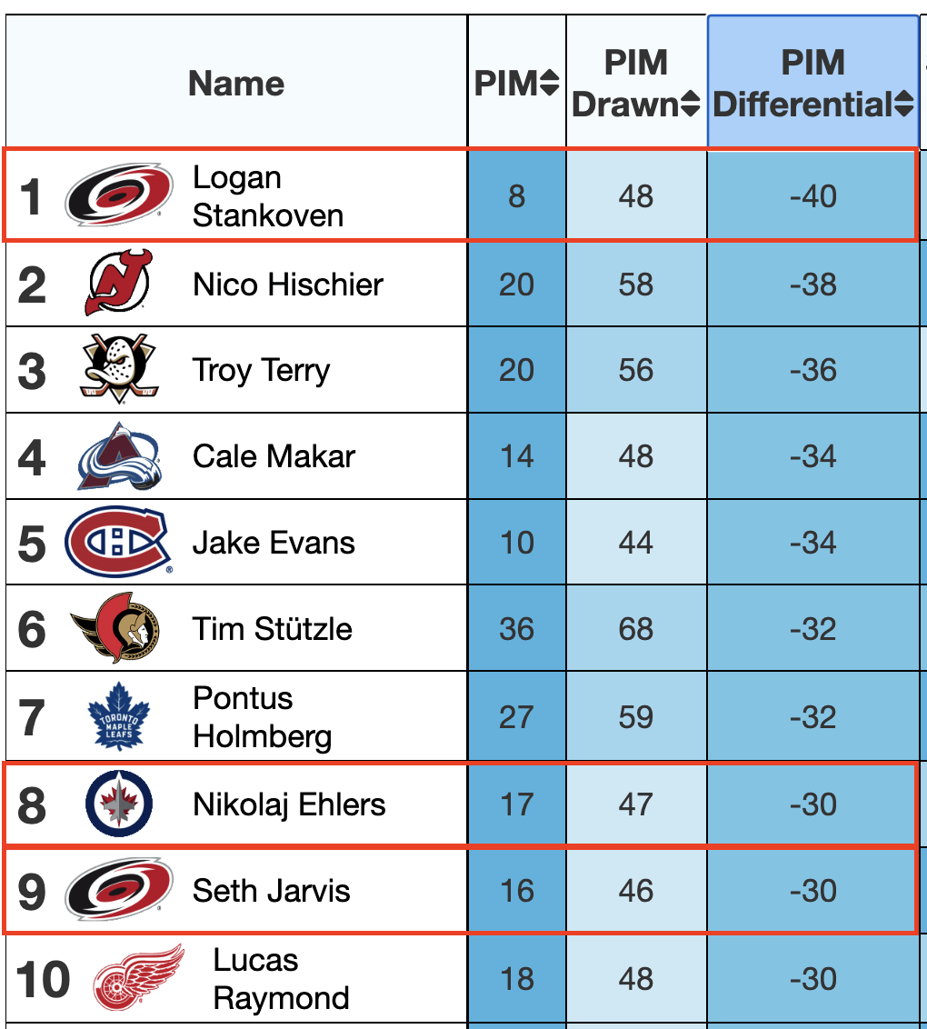 It seems like it can be hard for a player's game to be intense, physical, and dynamic enough to draw penalties, while also being disciplined and responsible enough to not take penalties. Turns out the #1 player in the whole NHL in this category last year was none other than our own Logan Stankoven! We also have two more players in the top 10 in this category, Ehlers and Jarvis.