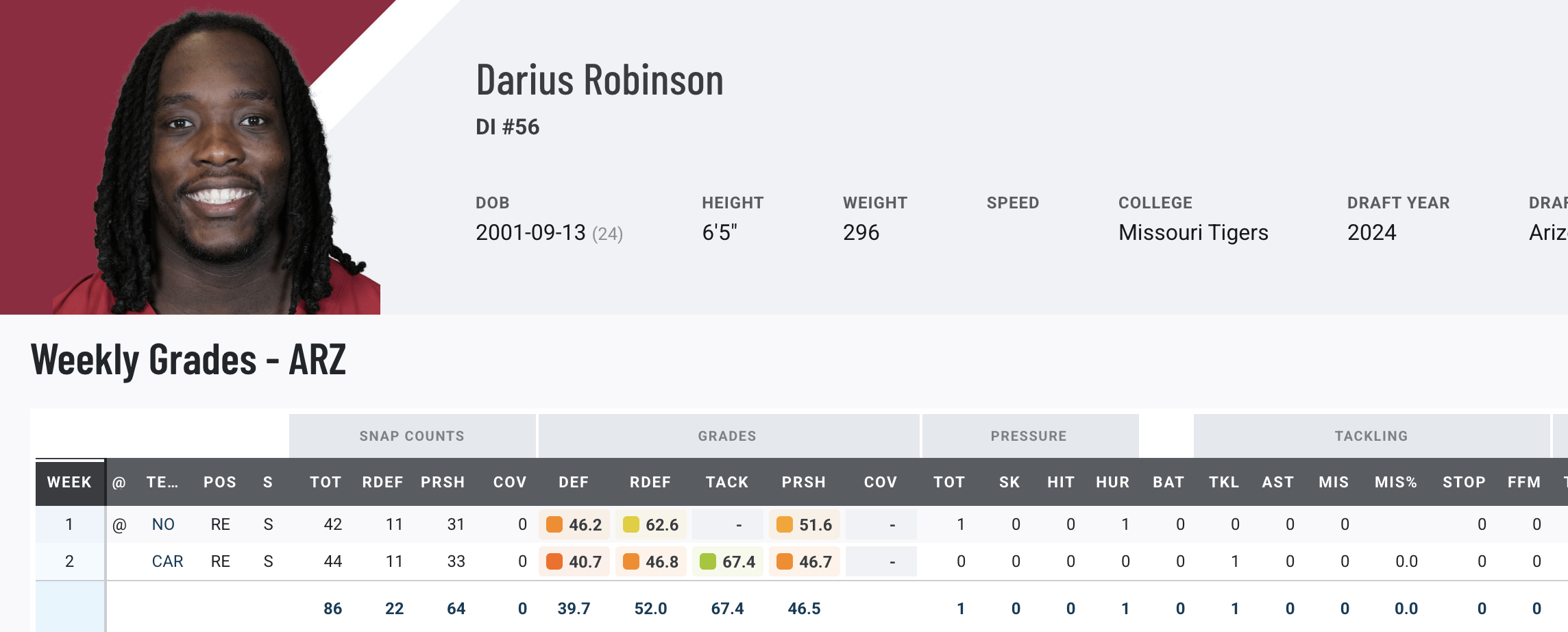 I know PFF isn't gospel, but it gives a baseline of how a player is performing. Out of 124 DI who have played at least 20% of their teams snaps, Darius Robinson ranks 118th in PFF grade at 39.7. He has recorded a mere 1 pressure and a single tackle.