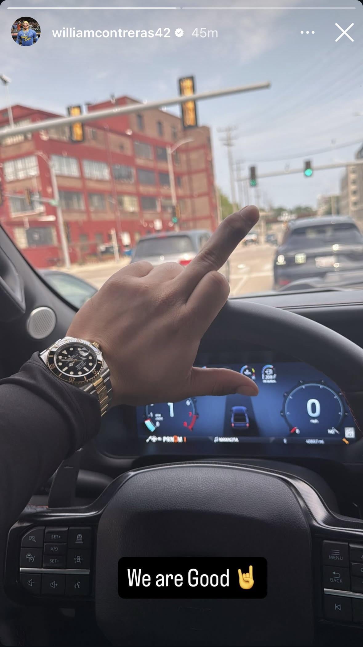 Driver in front of him looking in the rear view trying to figure out what they did wrong to be flipped the bird