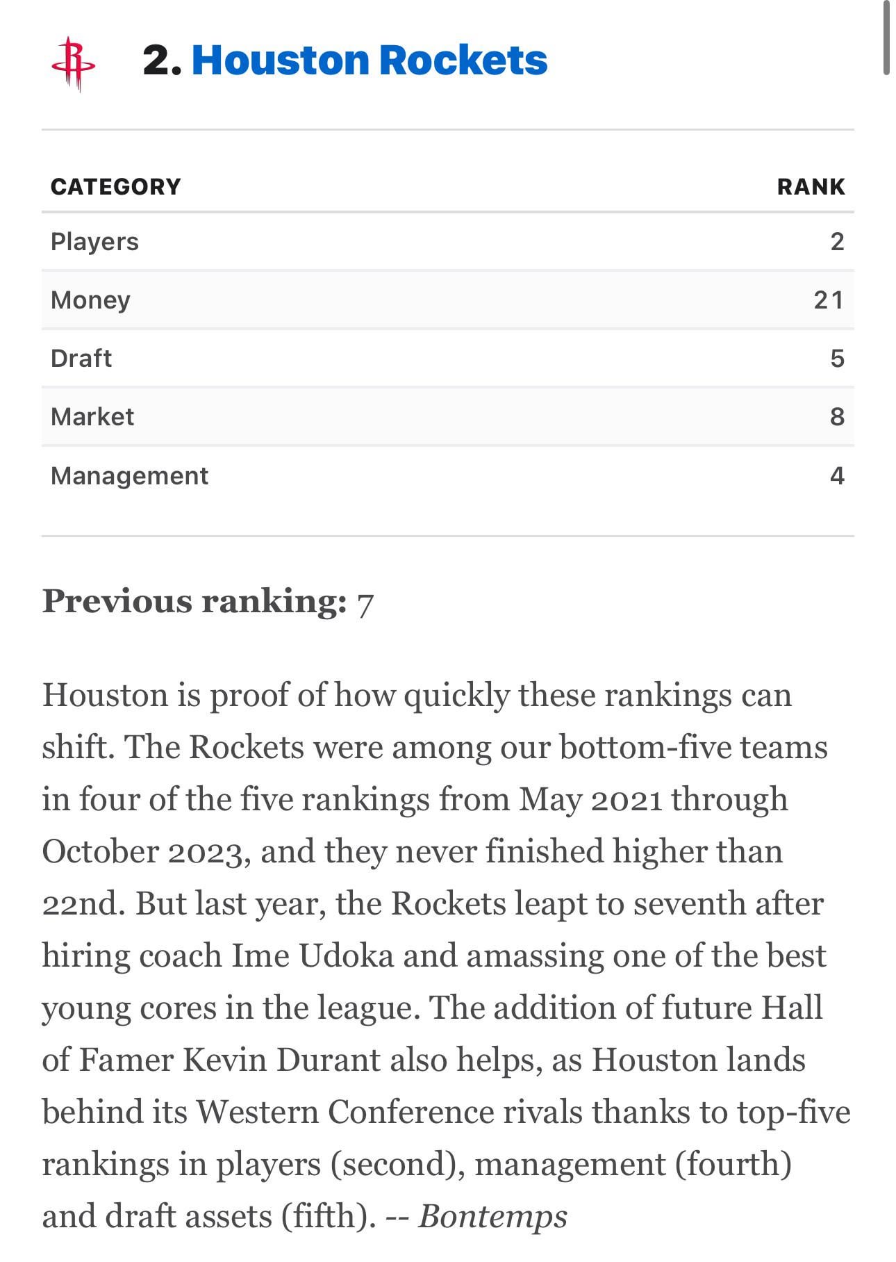 The Rockets are ranked second in ESPN’s future power rankings, which project how successful teams will be over the next three seasons 🚀🚀🚀 2 comments https://www.espn.com/nba/story/_/id/46271632/nba-future-power-rankings-three-year-outlook-thunder-lakers-warriors-knicks-spurs-30-teams Before this thread goes too far, reminder that three years ago, Grizzlies were 1st, Heat were 2nd, Suns were 3rd, Bucks were 4th and the Thunder were 24th. These mean nothing. Leave a ReplyYou must be logged in to post a comment.