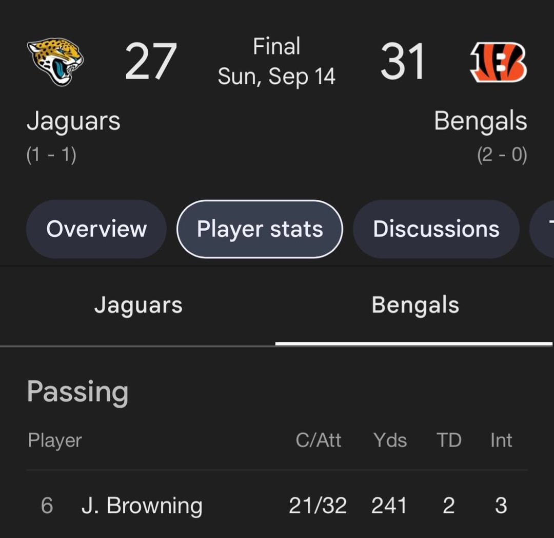 Jake Browning threw for around 200 yds chucked up 3 INTs to the Jaguars and the Bengals won by 4. When Bryce threw 2 INTs to the Jaguars we lost by 16… Jalen Hurts put up 101 passing yds against the Chiefs and 0 passing TDs and the Eagles won. Josh Allen threw for 148 yds and no passing or rushing TDs and the Bills won by 20. Michael Penix Jr. threw for 135 yds and no passing TDs and the Falcons won comfortably. Hell, Geno Smith threw for 180 yds and chucked up 3 INTs and the Raiders still had a chance in that game up until the end. My point in saying this is that Bryce Young cannot afford to be anything short of flawless for this team to have a fighting chance every week. Do I think that Bryce Young is the answer for the Carolina Panthers? No. But there are less than maybe 5 qbs across the NFL that could have success with this team(much less consistent success) and I'm tired of people thinking that we can just pick up some other qb and become a winning team all of a sudden. This is not a post to cry and make excuses for Bryce, I'm past the point of seeing him as the savior for the Carolina Panthers. I'm just saying it's gonna be time to wake up and smell the coffee when some competent organization picks him within the next few years and he has actual success.