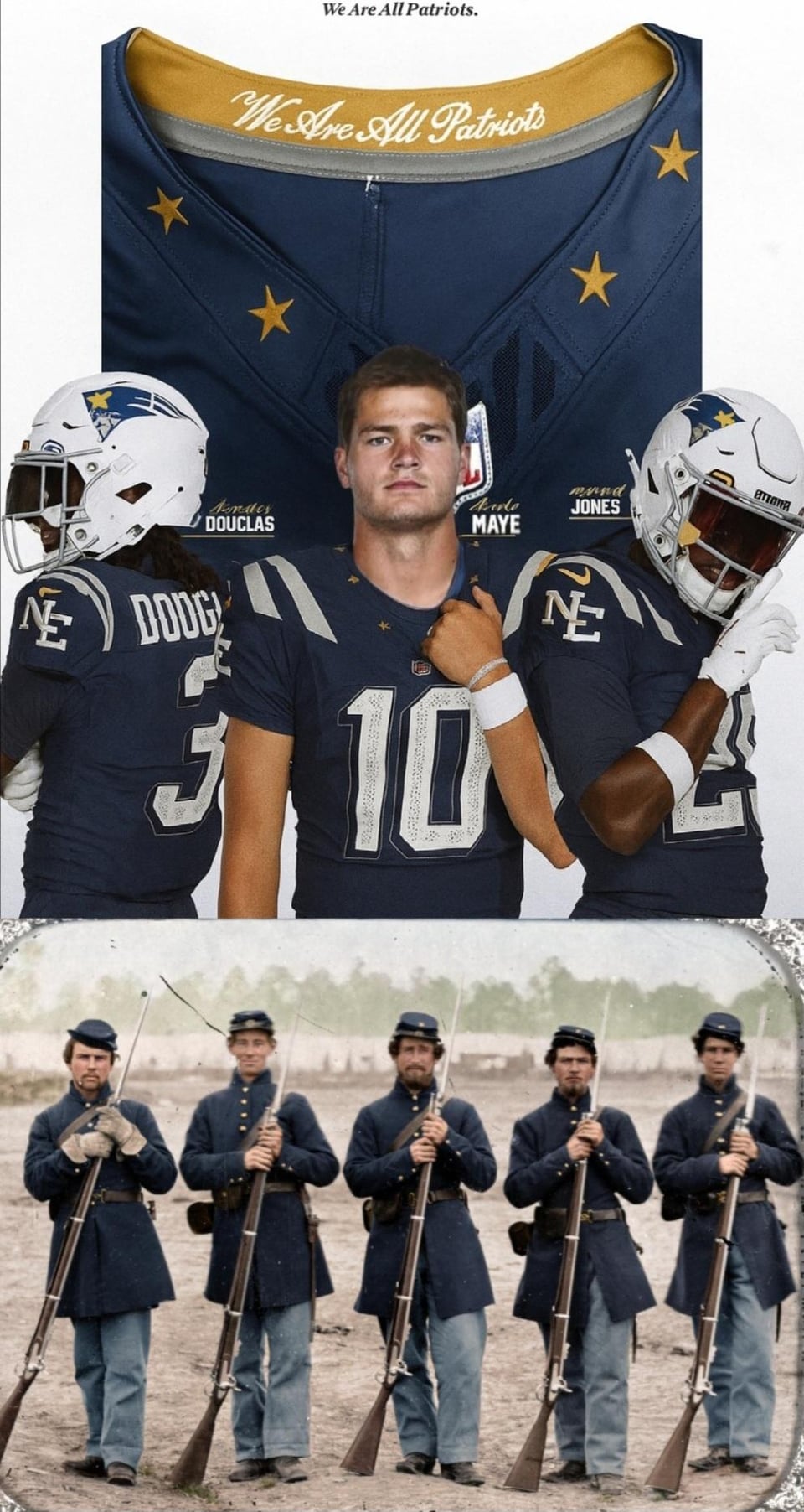 Personally I'd love to see a take on a blue Civil War uniform, and perhaps a 'Pete Patriot' alternate logo to compliment the Revolutionary 'Pat Patriot'. Switch up the Miltia in the End Zone.