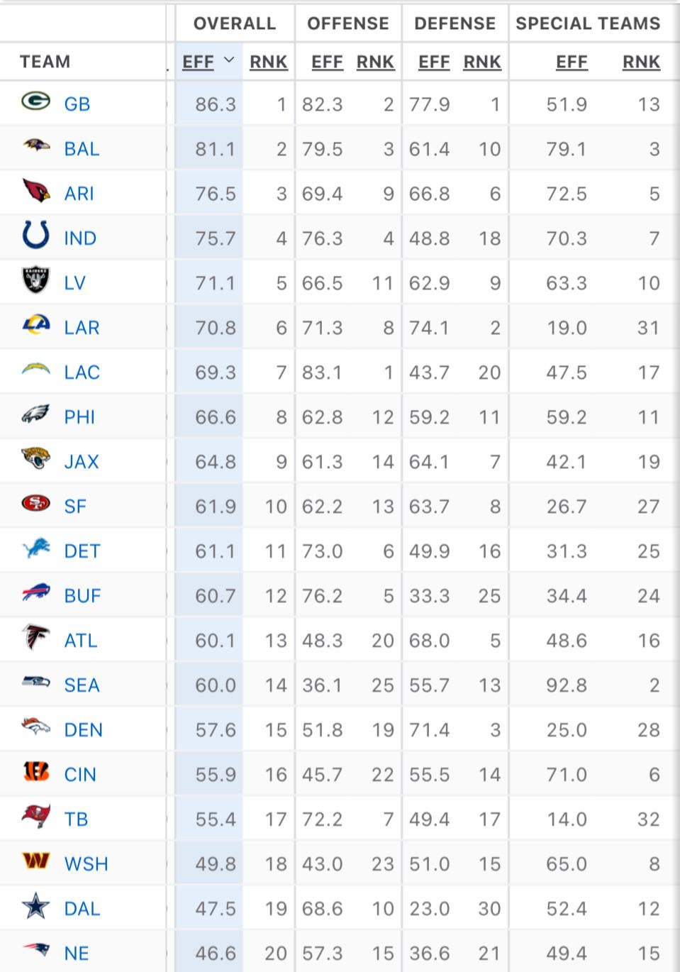 “Team efficiencies are based on the point contributions of each unit to the team's scoring margin, on a per-play basis. The values are adjusted for strength of schedule and down-weighted for "garbage time" (based on win probability). The scale goes from 0 to 100; higher numbers are better and the average is roughly 50 for all categories. Efficiencies update daily during the season.”