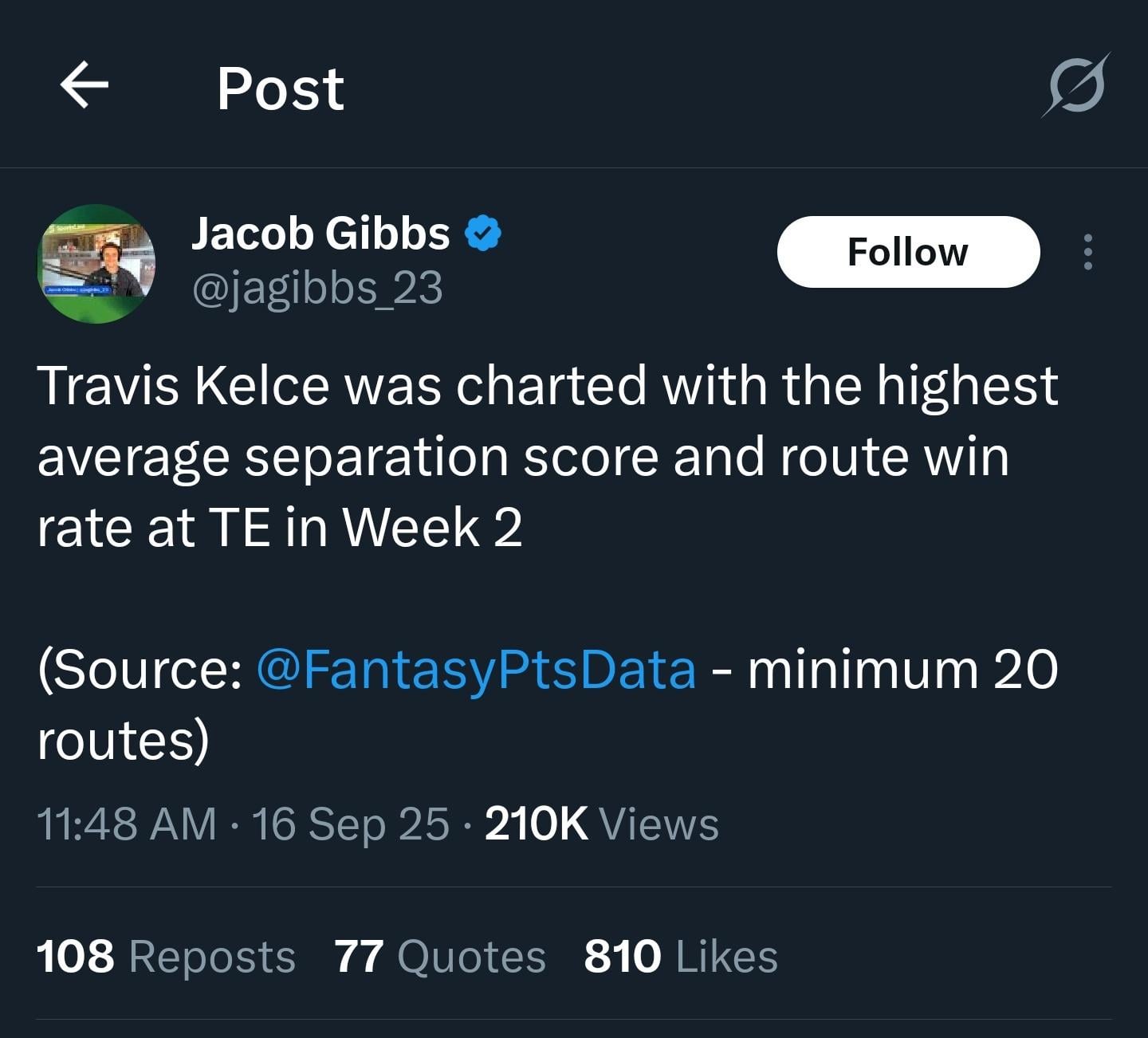 [Gibbs] Travis Kelce was charted with the highest average separation score and route win rate at TE in Week 2