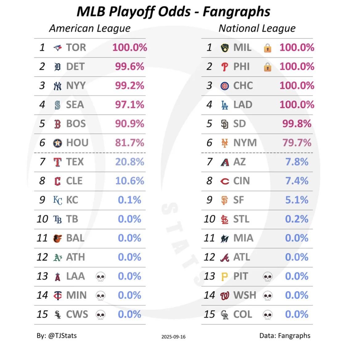 So you’re saying there’s a chance! 15 comments Didn’t we win like 17 in a row the last year of Schildt? The real chance is probably more like 0.002% given the number of things that would have to happen at the same time. They’re going to storm back from the brink like Buffalo did a few weekends ago. What were our odds that last year with Schildt the day before the 17 game win streak began? Anyone know? We have double the chances of the Royals!  No. There’s no chance. There IS a chance of a lottery draft pick, though, if they’ll keep losing. Much better chance than the royals It’s sad they are still in it to be honest but the Mets sure as hell don’t want it lol Wait is Chicago clinched? What was all that one in a million talk?  I’m not listening! Cards-Royals World Series. Who says no No I’m saying “There never was much hope, Mr. Frodo.” Leave a ReplyYou must be logged in to post a comment.