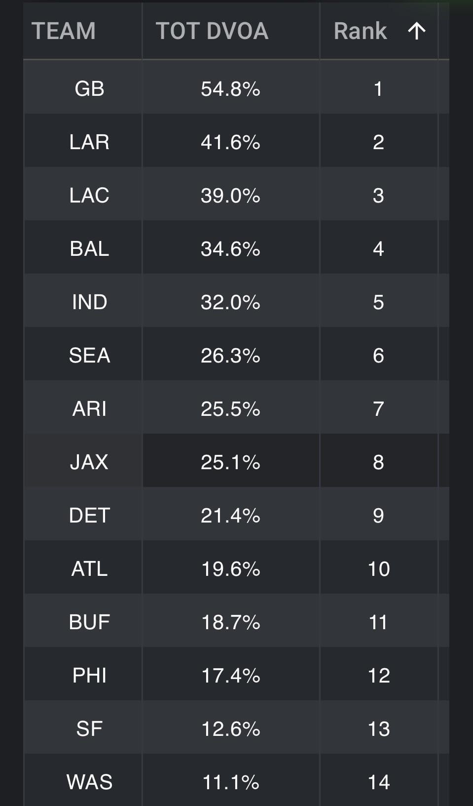 “DVOA is a method of evaluating teams, units, or players. It takes every single play during the NFL season and compares each one to a league-average baseline based on situation. DVOA measures not just yardage, but yardage towards a first down: Five yards on third-and-4 are worth more than five yards on first-and-10 and much more than five yards on third-and-12. Performance is also adjusted for the quality of the opponent. DVOA is a percentage, so a team with a DVOA of 10.0% is 10% better than the average team, and a quarterback with a DVOA of -20.0% is 20% worse than the average quarterback. Because DVOA measures scoring, defenses are better when they are negative. Every year is normalized so the average for that year is 0%. For more detail, read below.”