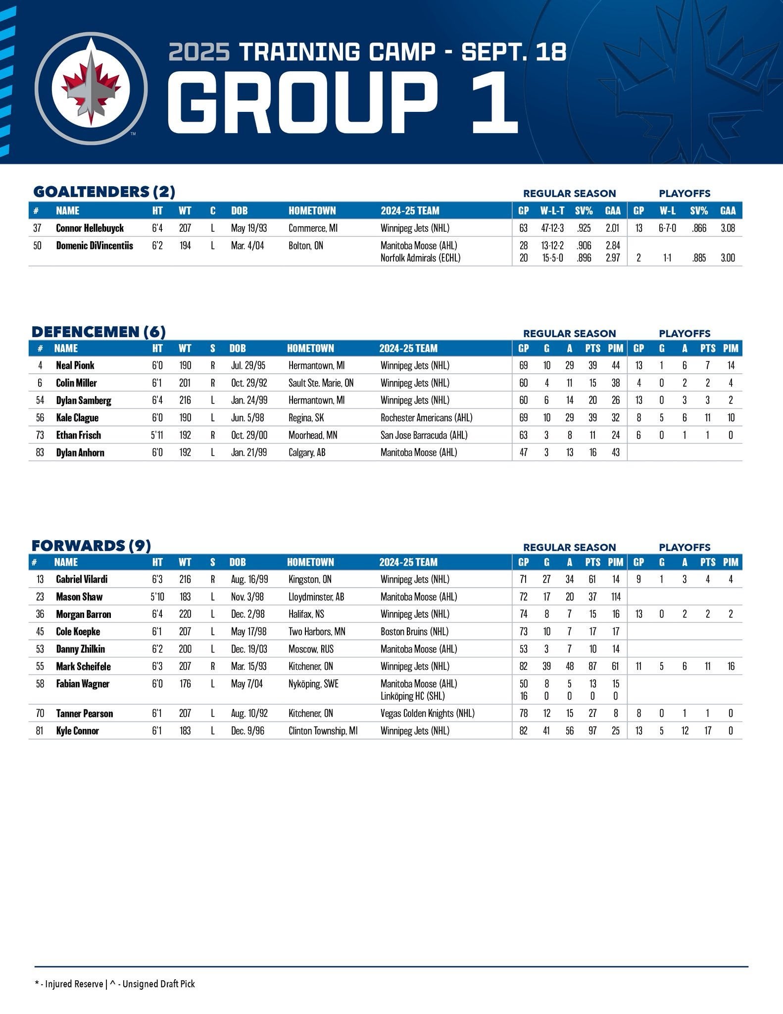 Winnipeg Jets Training Camp Groups 5 comments ***Reposting due to imgur compressing badly on the first one*** The groups will get smaller as players are cut but I think the forward lines (at least to start camp) have been spelt out. Connor-Scheifele-Vilardi Perfetti-Toews-Nyquist Nino-Namestnikov-Iafallo Pearson-Barron-Koepke The top 4 on defence is obvious as well but the 4 guys competing on the bottom pairing are all in the same group so nothing obvious there. I do hope Chibrikov is given the best opportunity to take a 4th line spot looks like Chib might get a shot to rotate in with 62-7-9 and Lambo a shot with 91-19-14 Which arena are the camps being held? Open to the public? Apparently Chibrikov grew an inch and put on a good amount of weight over the summer. Nice to see a guy putting in the work to get stronger. I forgot Collin Miller was still a Jet. Leave a ReplyYou must be logged in to post a comment.