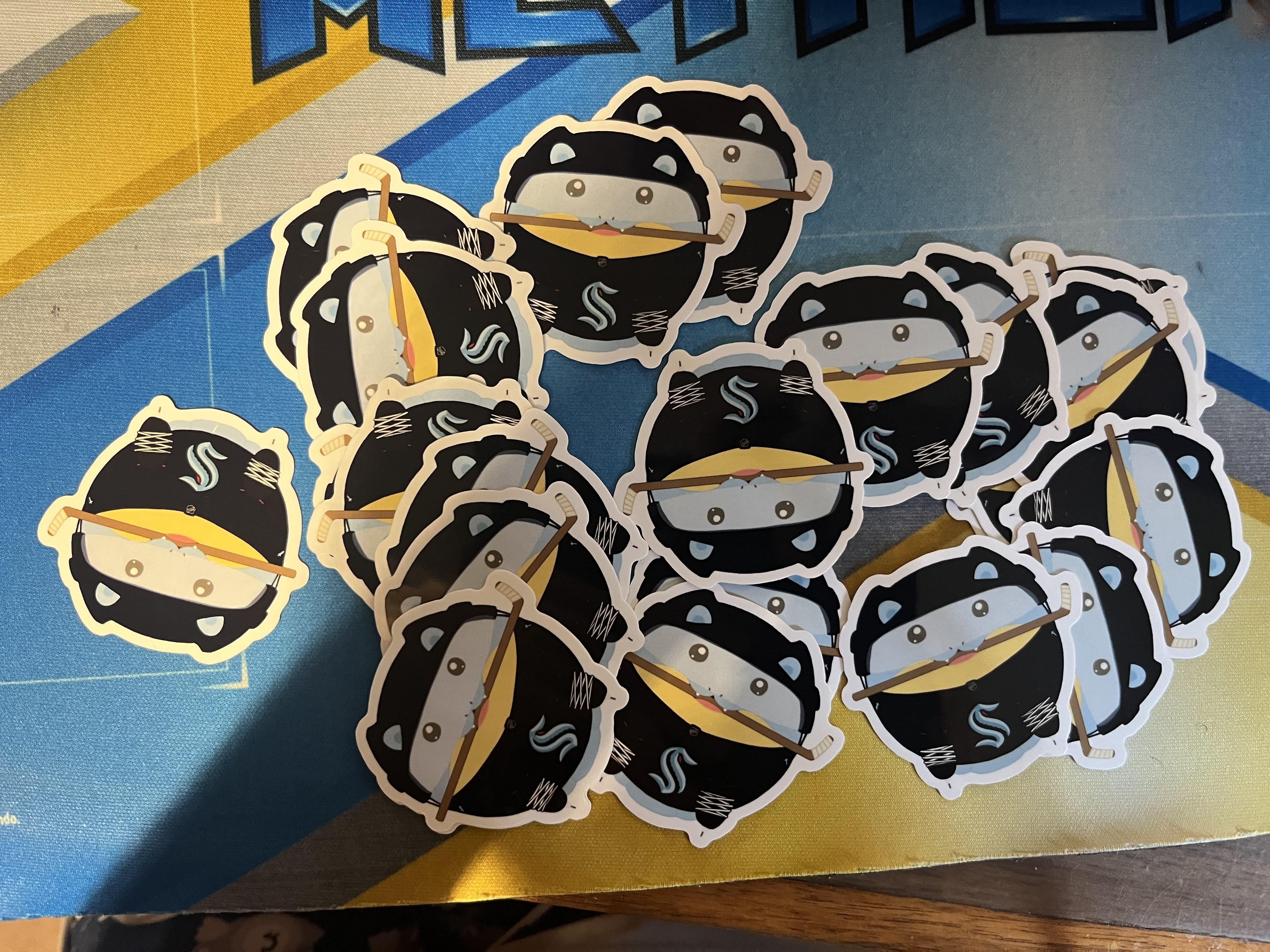 So I ordered 10 stickers, and 24 arrived. Which is crazy because the site I used sells stickers in sets of 10 so I don’t where the 4 came from. I do not need two dozen stickers. So alongside hoping to get these into the hands of some players, I thought I might as well give them away to some other Kraken fans at the game in Toronto!