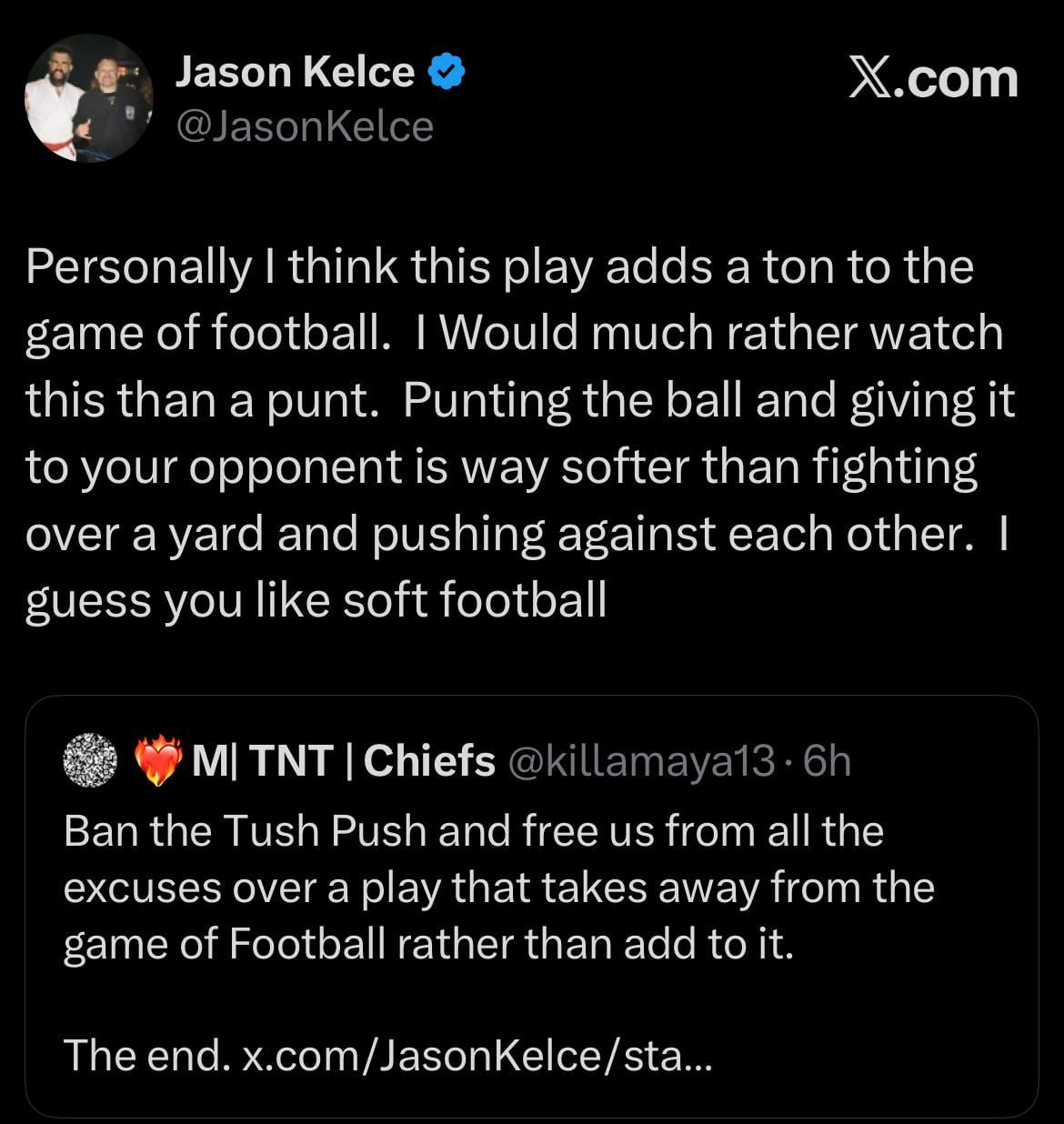 We get it, he’s backing the birds, I have no issue with him saying “If you don’t like it stop it.” and dropping the issue there, but to try and make it seem like backing the tush push is some kind of virtuous protecting of the best parts of football – spare me bro.