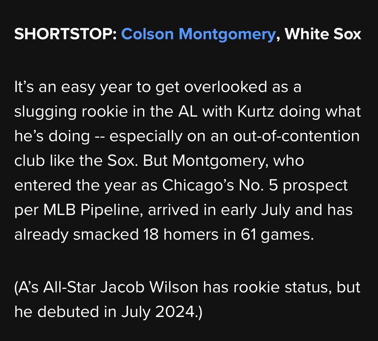 I am just so confused how they say it’s easy to overlook a slugging rookie in the AL on an out-of-contention team and then use Nick Kurtz and Jacob Wilson as examples.