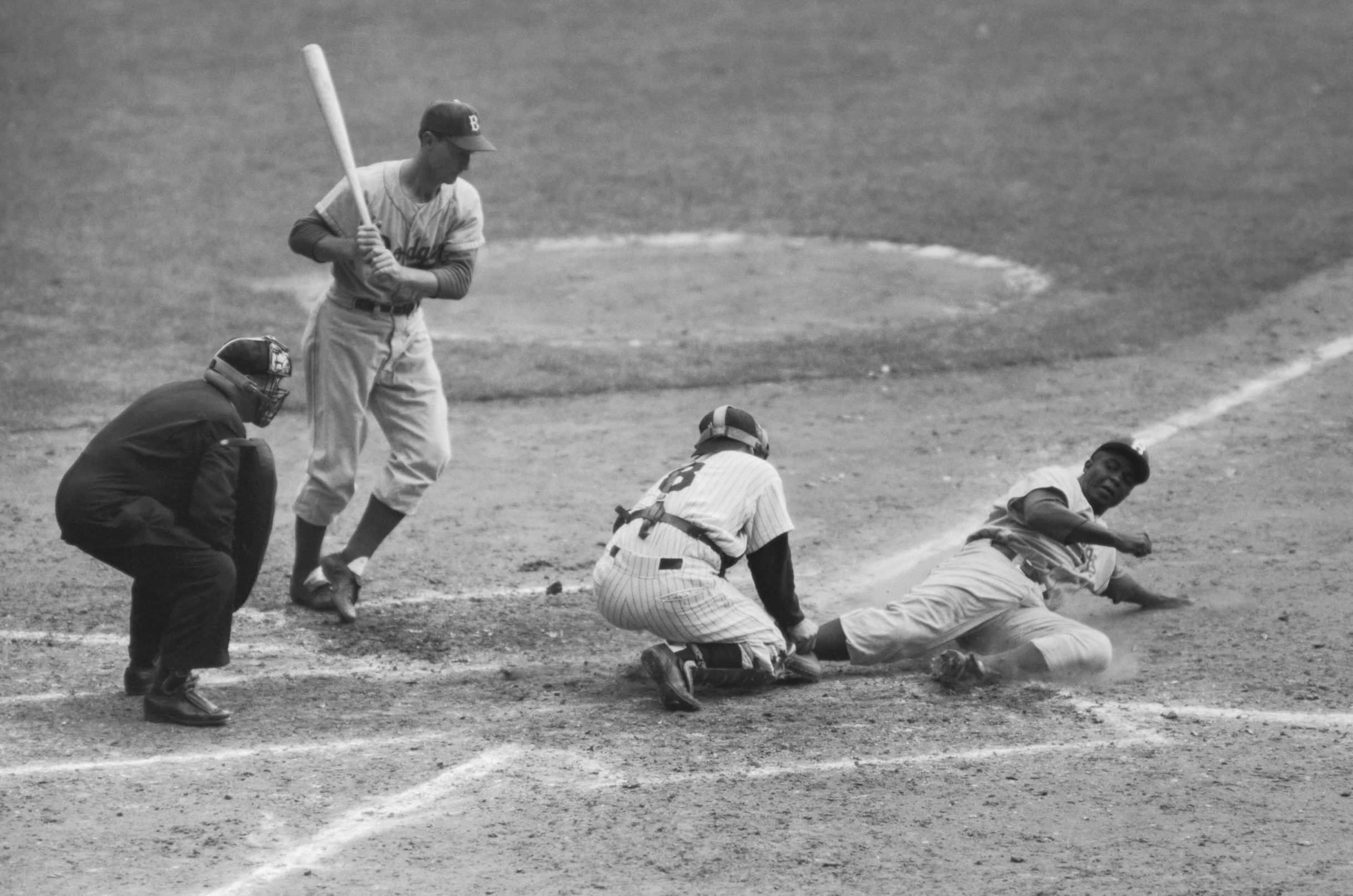Jackie Robinson of the Brooklyn Dodgers stealing home against Yogi Berra and the New York Yankees in the 1955 World Series. (Getty Images)