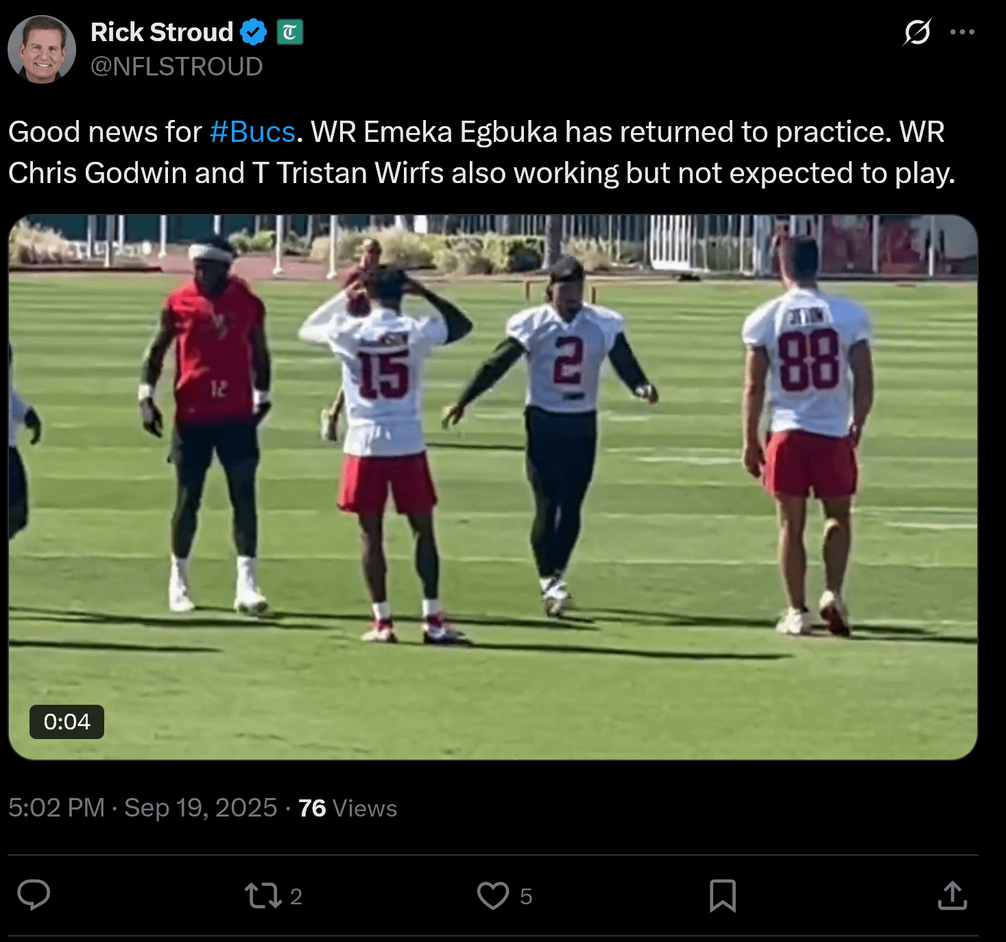 [Rick Stroud] Good news for #Bucs. WR Emeka Egbuka has returned to practice. WR Chris Godwin and T Tristan Wirfs also working but not expected to play.