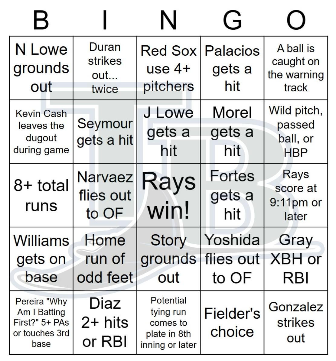 Rays vs Red Sox Bingo, 9/19/2025