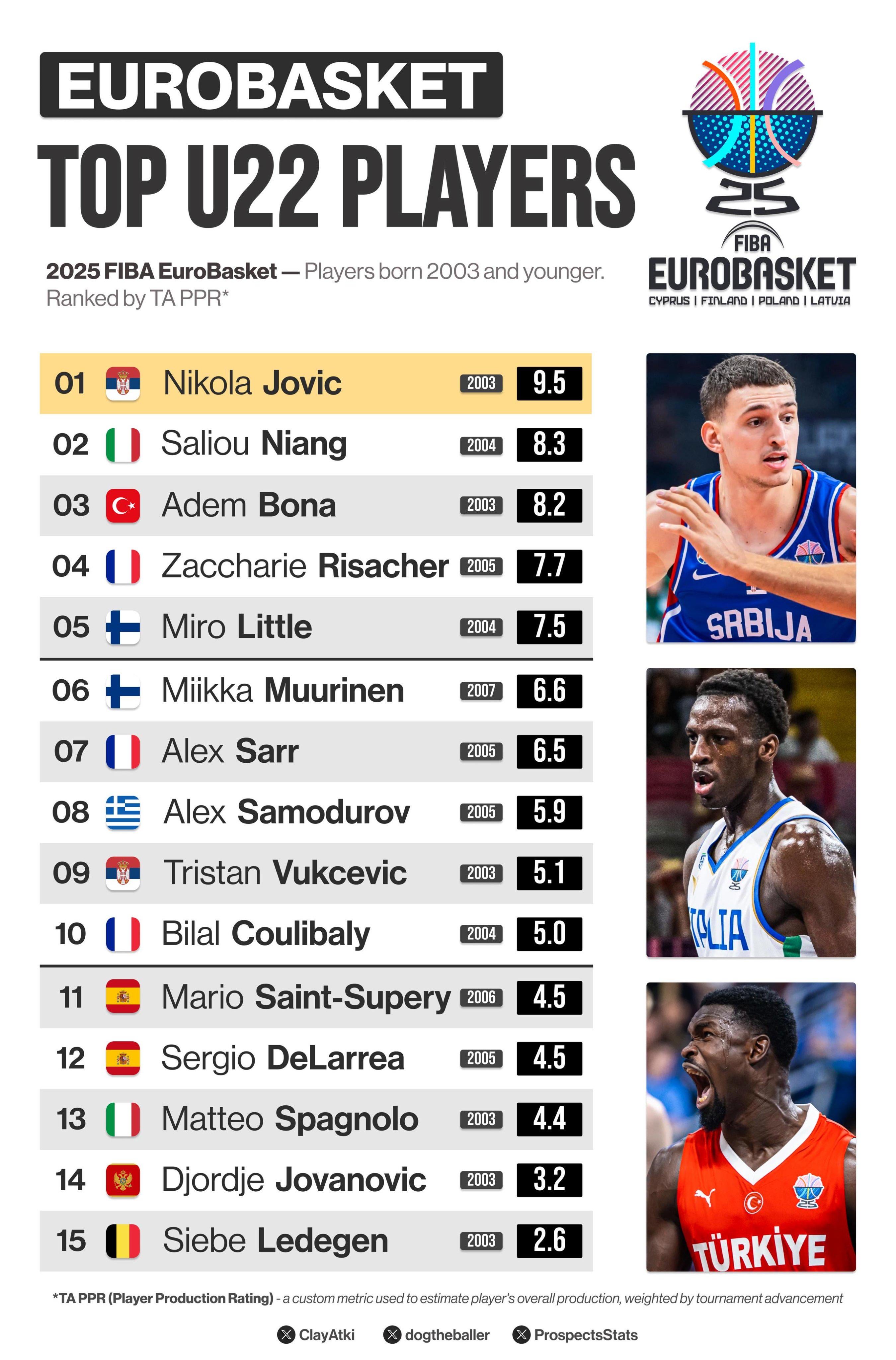 [Atkinson] Now a look at U22 players (born 2003 or later)! Here are the top 15 for the 2025 EuroBasket, ranked by tournament advancement–adjusted PPR 📊