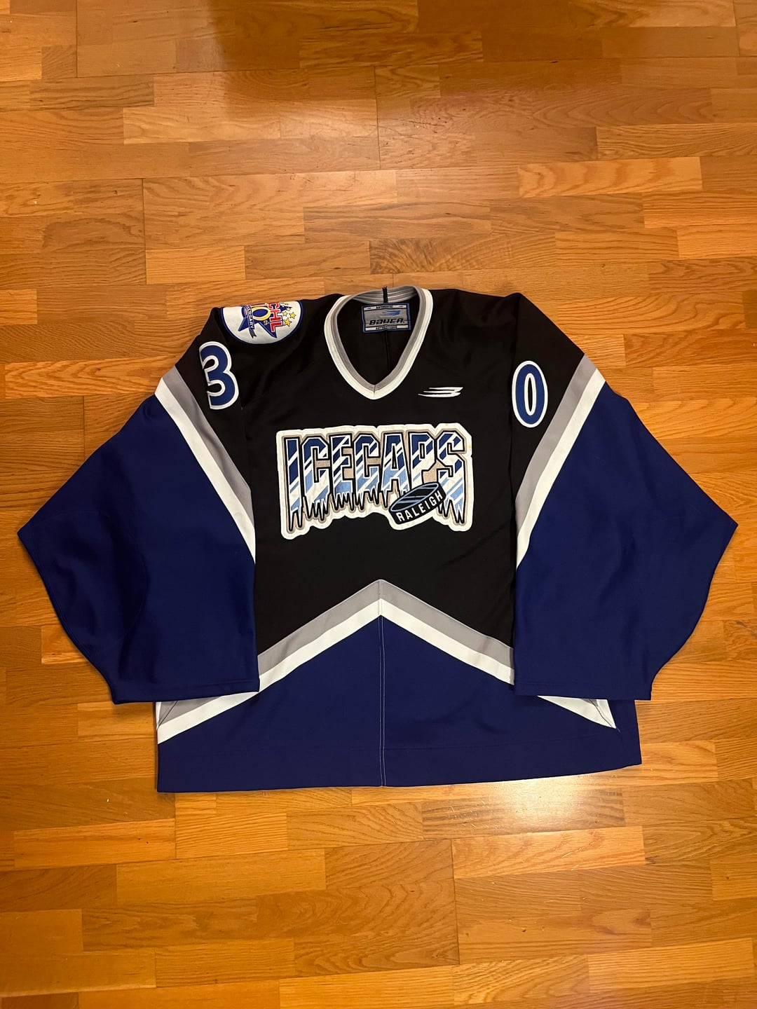 Picked up this game worn jersey for my collection today! The team that played in Raleigh before the canes! This is from 1997-1998 before the Icecaps moved due to the Hurricanes coming to town. Note, the last picture isn’t the jersey being used during a game, contrary to popular belief